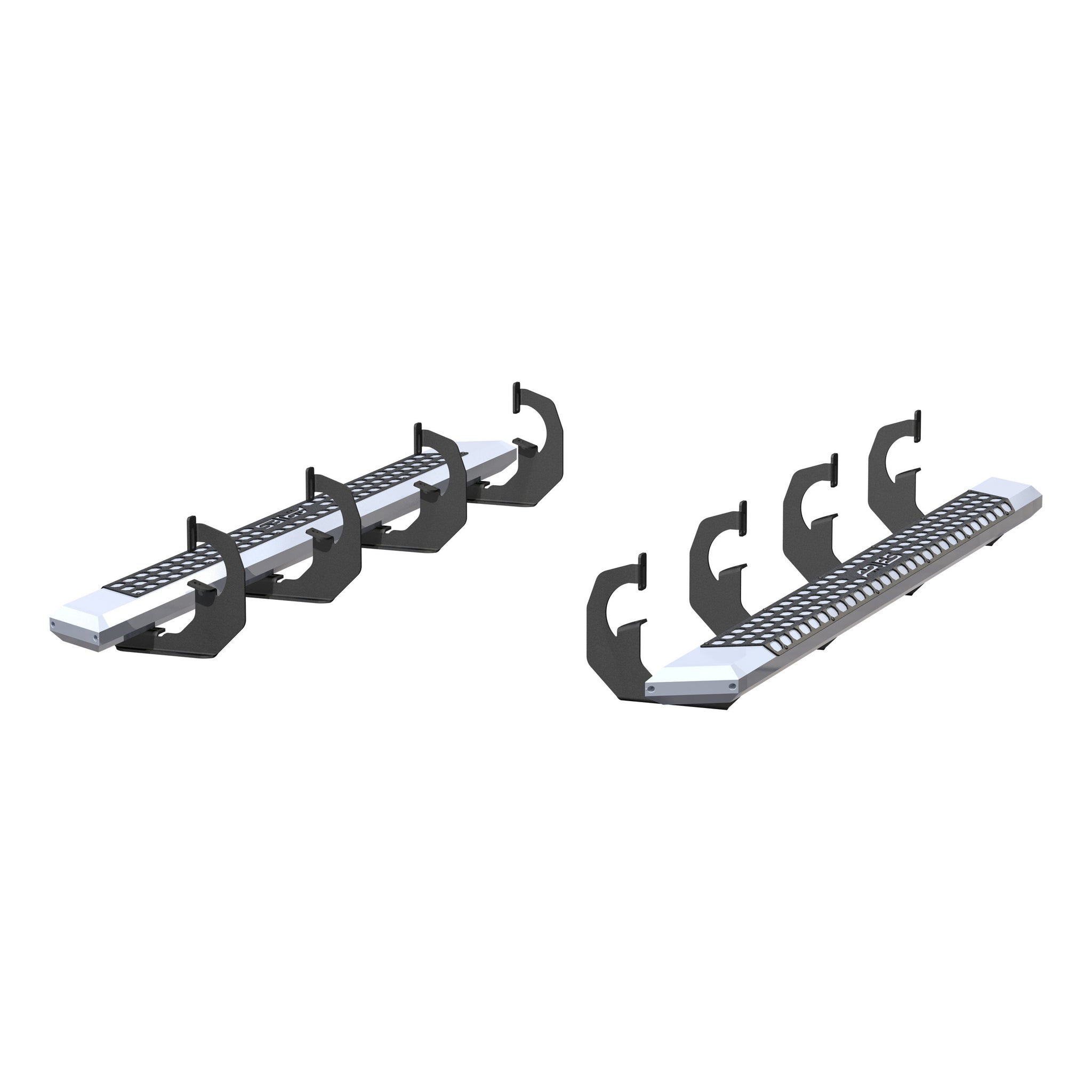 ARIES AdvantEDGE side bars do away with the common, rounded look of other side bars, nerf bars and running boards, featuring an angular, eight-sided tube profile and powder-coated all-aluminum construction. The angular edges provide a clear-cut, uncompromising accent for the look of today's trucks. Made from 5-1/2" wide, eight-sided, extruded aluminum tubing, AdvantEDGE running boards are strong, lightweight and impervious to rust, offering a solid step that is built to face the elements and outlast them. They also come with die-cast aluminum end caps and a stamped aluminum tread. The aluminum treads provide a long-lasting, non-skid stepping surface that will not crack or fade in the sun. ARIES AdvantEDGE side bars are also marked for their easy, custom-fit installation. They feature the ARIES VersaTrac mounting system with brackets that are made from powder-coated steel and built for specific vehicles. This particular set of custom running boards fits specific years of the Chevy Silverado 1500, 2500 HD, 2500 HD Classic, 3500 HD, 3500 Classic or Tahoe and GMC Sierra 1500, 1500 Classic, 2500 HD, 2500 HD Classic, 3500 HD, 3500 Classic or Yukon (see application info to verify compatibility). The high-strength steel brackets mount using pre-existing holes, and the aluminum running boards attach to the brackets with heavy-duty hardware. The VersaTrac mounting system makes installation simple and customizable, allowing the side bars to be swapped out at any time with other side steps or running boards that use the VersaTrac system. Setting yourself apart is simple with the ARIES AdvantEDGE series. In addition to these truck side steps, we also offer the AdvantEDGE bull bar and AdvantEDGE headache rack, featuring the same all-aluminum construction and eight-sided tube profile. For a fully customized look to match your pickup, AdvantEDGE side bars are available in two finish options, including carbide black powder coat and chrome powder coat.