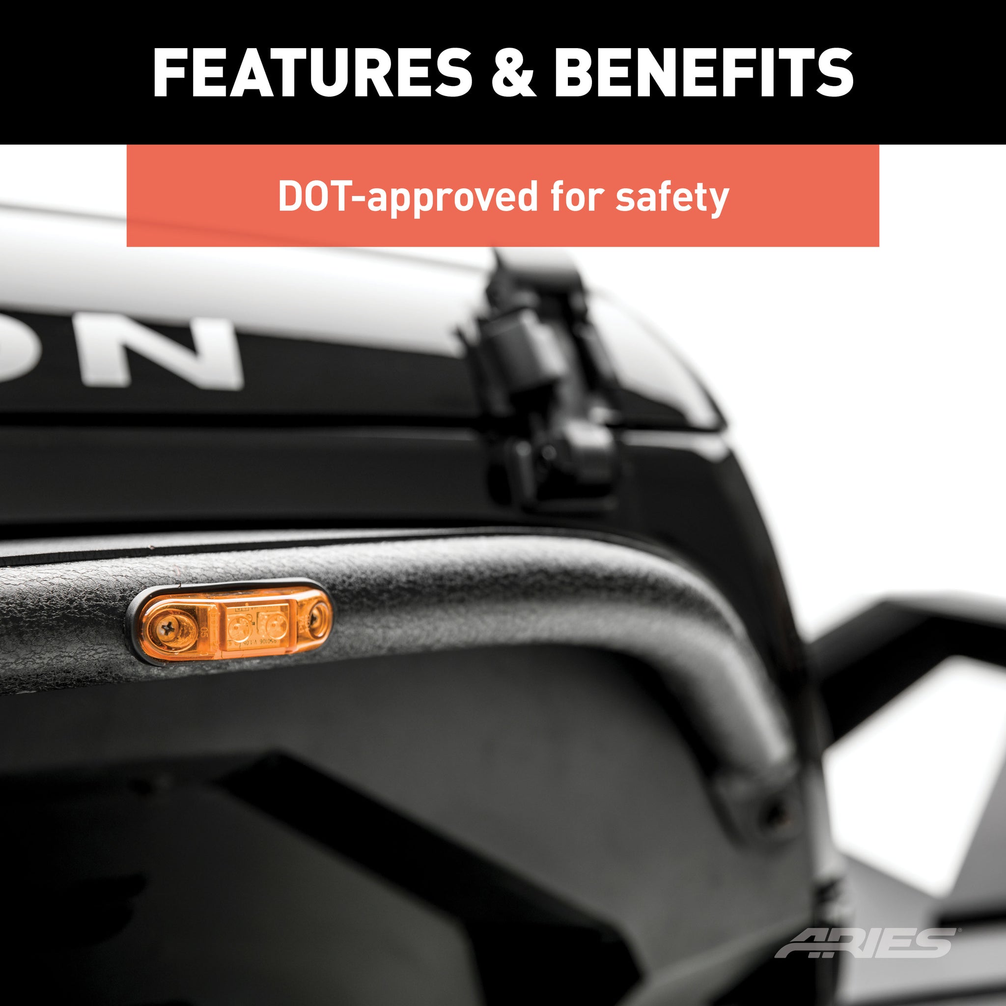 ARIES fender flares help transform your Jeep Wrangler into the ultimate trail hog with their lightweight aluminum construction, 4" width and vehicle-specific contour. To make your mudding machine safe on the trail and on the road, ARIES Jeep fender flare side markers offer bright, DOT-approved LED light and a splice-in installation to your factory harness. When installing ARIES Jeep fender flares, the OEM side markers on your Jeep must be removed. However, you don't have to play the outlaw just to add some flare to your ride. ARIES Jeep side markers easily mount onto the side of the fender flares and offer a DOT-approved light. The LED components are long-lasting and built to shine brightly for added safety on the road. Installation of Jeep side marker lights is simple. The markers set into a plastic seat on the surface of the fender flare and use two set screws for a secure mount. The wiring splices directly to the existing factory wiring harness of the OEM side markers and is able to be channeled through the frame of the fender flare to keep it well-protected from rust and grime. Each side marker comes with color-coded wires and butt connectors for a complete installation. These side markers are compatible with ARIES front Jeep fender flares #1500201 and #1500202.