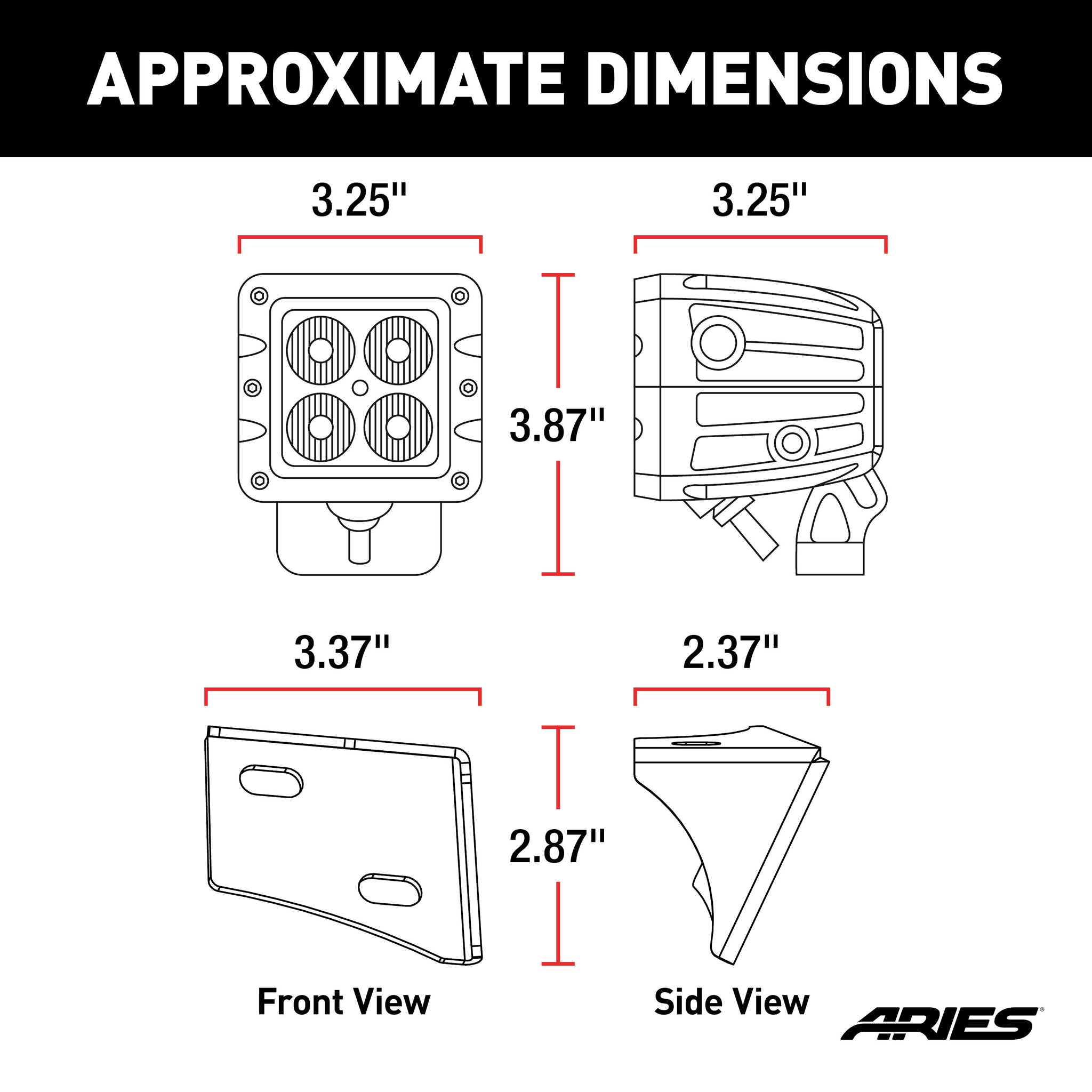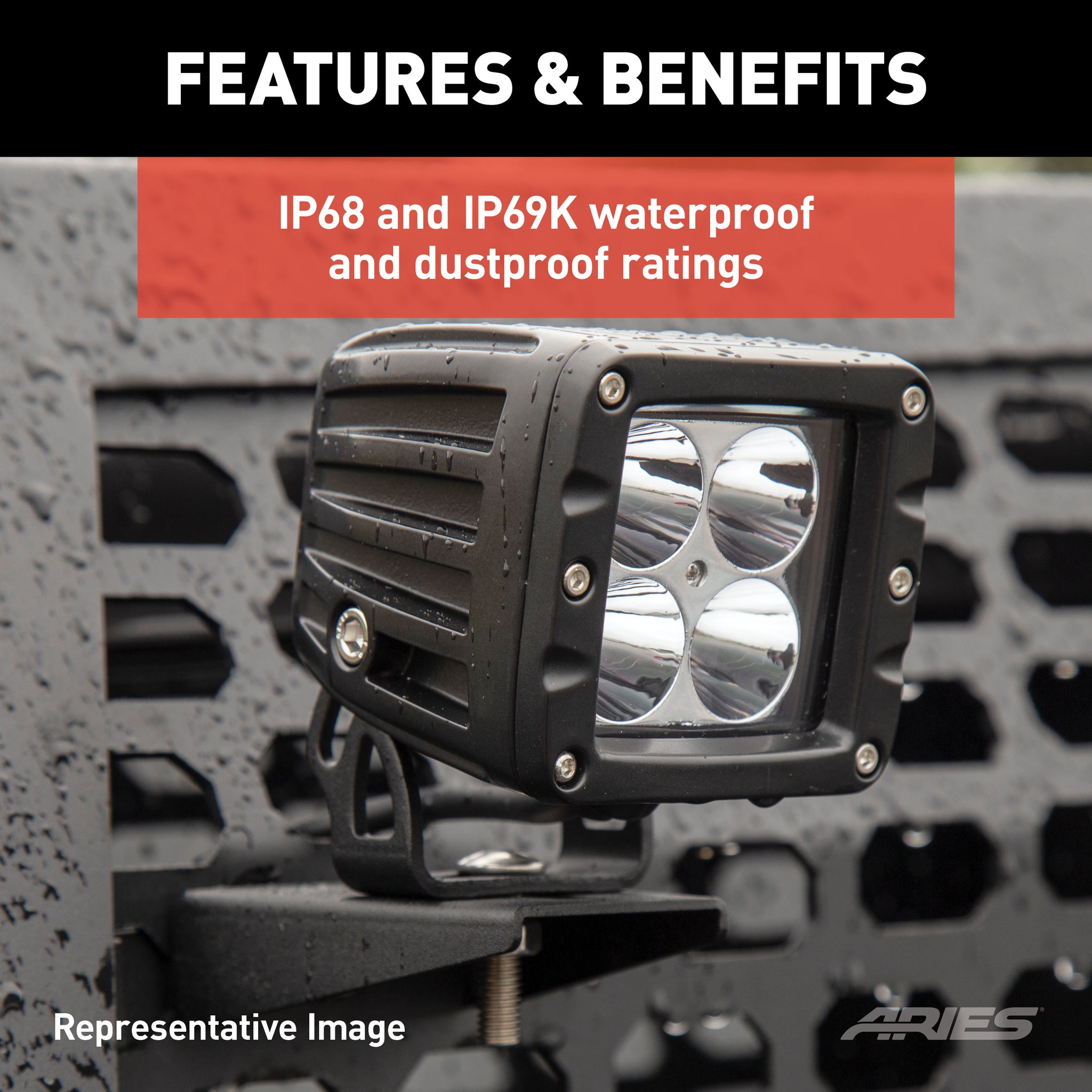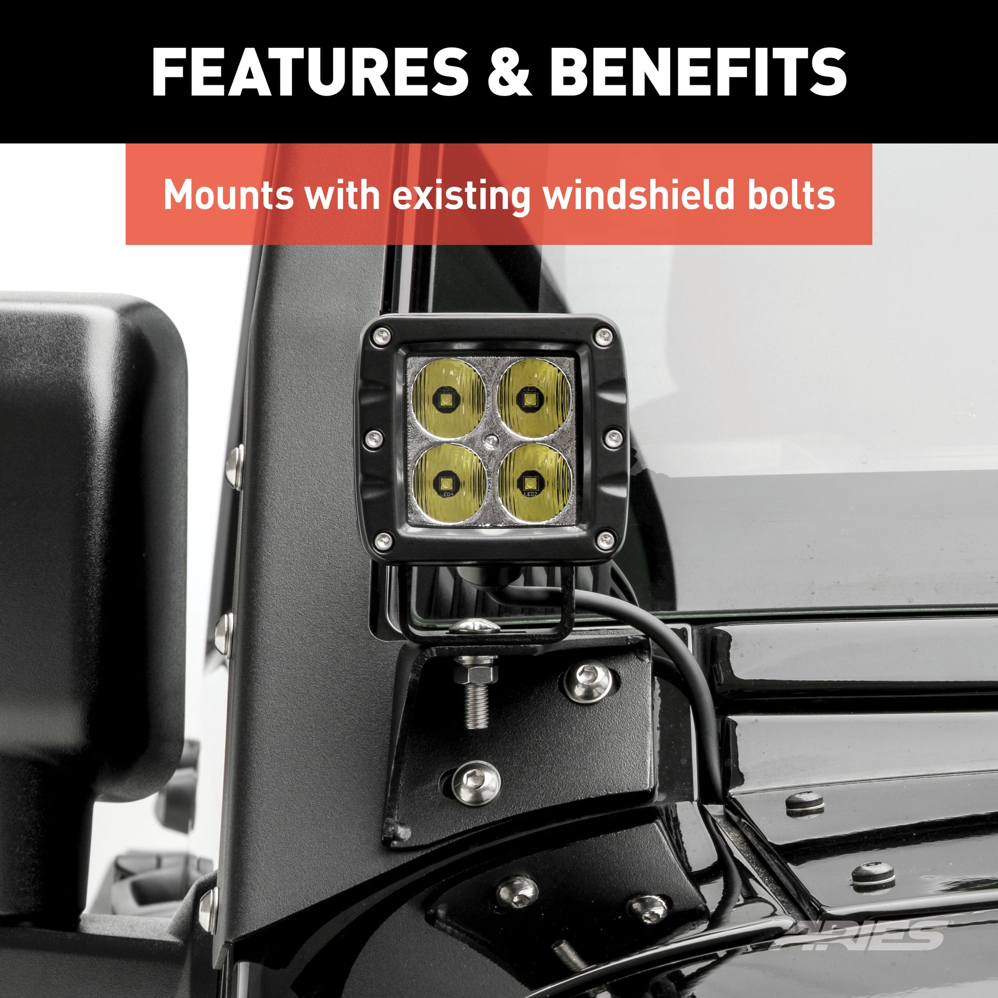 If you know the feeling of your tires treading through sand, the sense of adventure that comes at the start of a new trail or the taste of the open air at the top of a mountain, you know a little of what it feels like to own a Jeep. There is a sense of possibility unlike any other that comes every time you grip the wheel and throw the transmission into drive. Taking your Jeep experience to the next level means outfitting your 4x4 with truck accessories that are built for adventure. ARIES Jeep windshield light brackets allow you to mount work lights on your Jeep Wrangler, using the windshield hinges. They require no drilling and provide useful light for the road or trail ahead. This set of brackets comes with ARIES 2" square LED work lights and waterproof wiring harnesses for a complete installation. They feature high-strength carbon steel construction and come with a durable black powder coat finish for lasting protection against the off-road elements.
