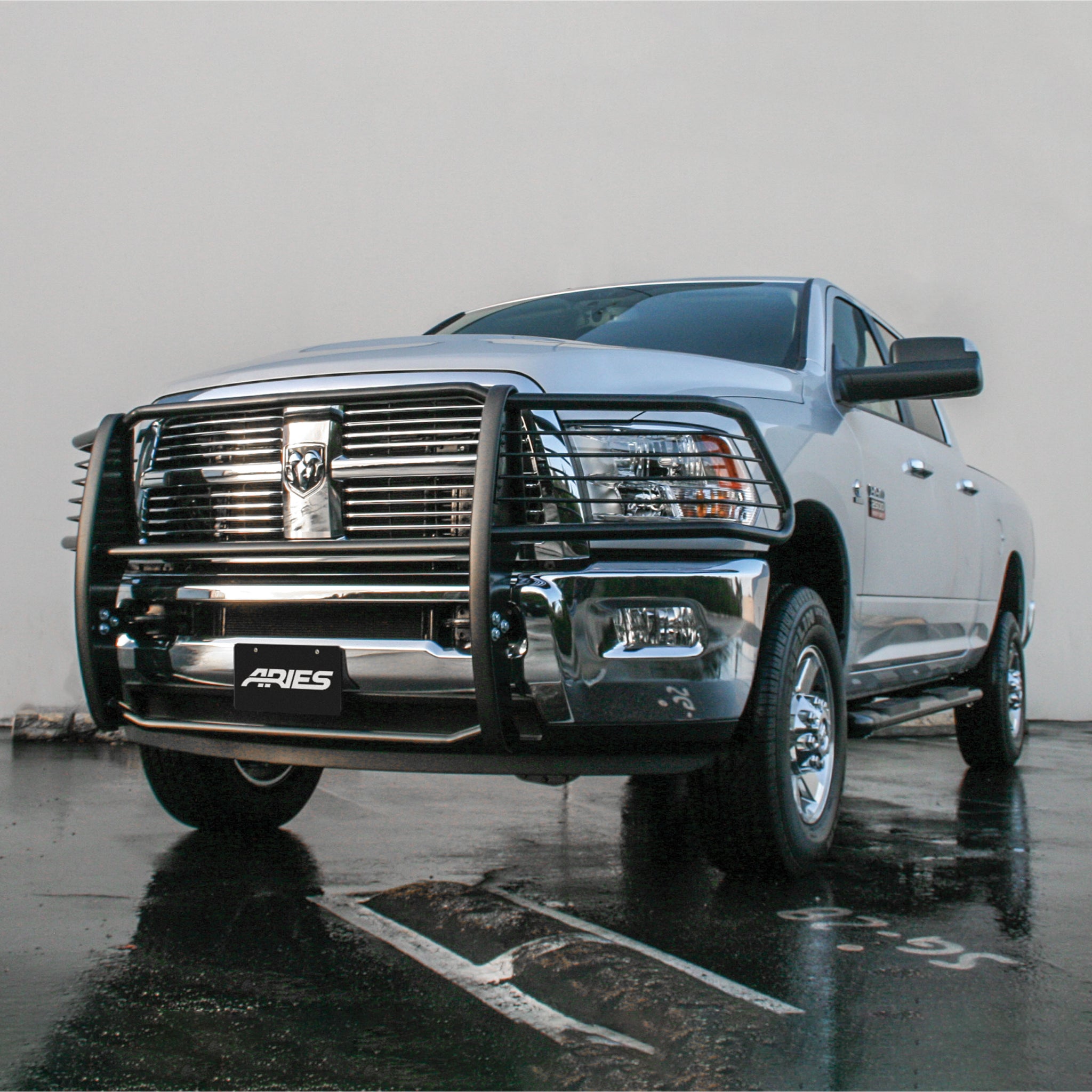 For the conqueror in every truck, Jeep or SUV owner, the ARIES grille guard offers the tough, trail-ready look you demand. It begins with a one-piece frame of 1/4" thick welded plates and 1-1/2" mandrel-bent tubing for a solid build. Each one is made with a vehicle-specific design for a better fit, easier install and more secure mounting. The side brush guards are custom-bent to contour to the profile of your vehicle, while the mounting brackets are positioned for a no-drill application. This means pre-existing factory holes are used to ensure optimum fitment and less vibration. This particular custom grille guard fits specific years of the Ram 2500 or 3500 and Dodge Ram 2500 or 3500 (see application info to verify). The ARIES grille guard also makes it easy to customize the look of your vehicle. Not only does the crossbar have two pre-drilled holes for mounting aftermarket LED lights, but many of our grille guards are also available in two finish options -- polished stainless steel or semi-gloss black steel. The stainless steel grille guard is made with 304 stainless, being high in nickel content and truly resistant to rust and corrosion. This option comes with a mirror-like polished finish for a definitive shine. The semi-gloss black grille guard is made with high-strength carbon steel for added strength. It features a tough, dual-layer E-coat and black powder coat finish to protect against rust, scratches and the elements. All ARIES grille guards also come with rubber stripping along the risers to protect the frame against scuffs and scratches.
