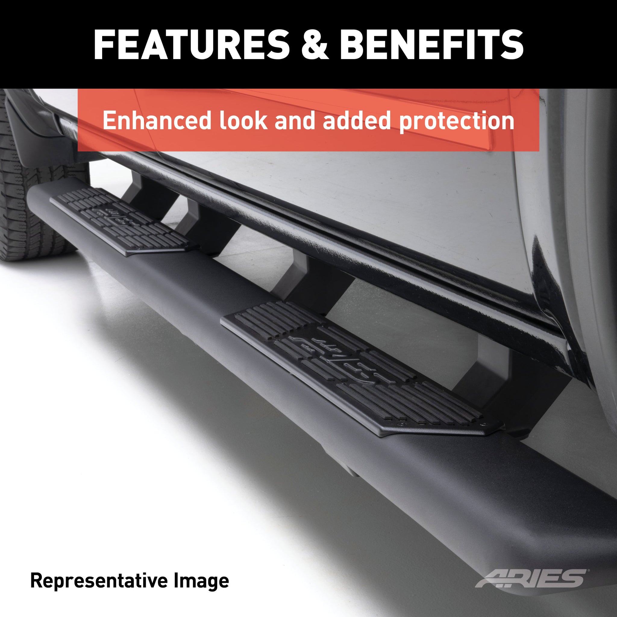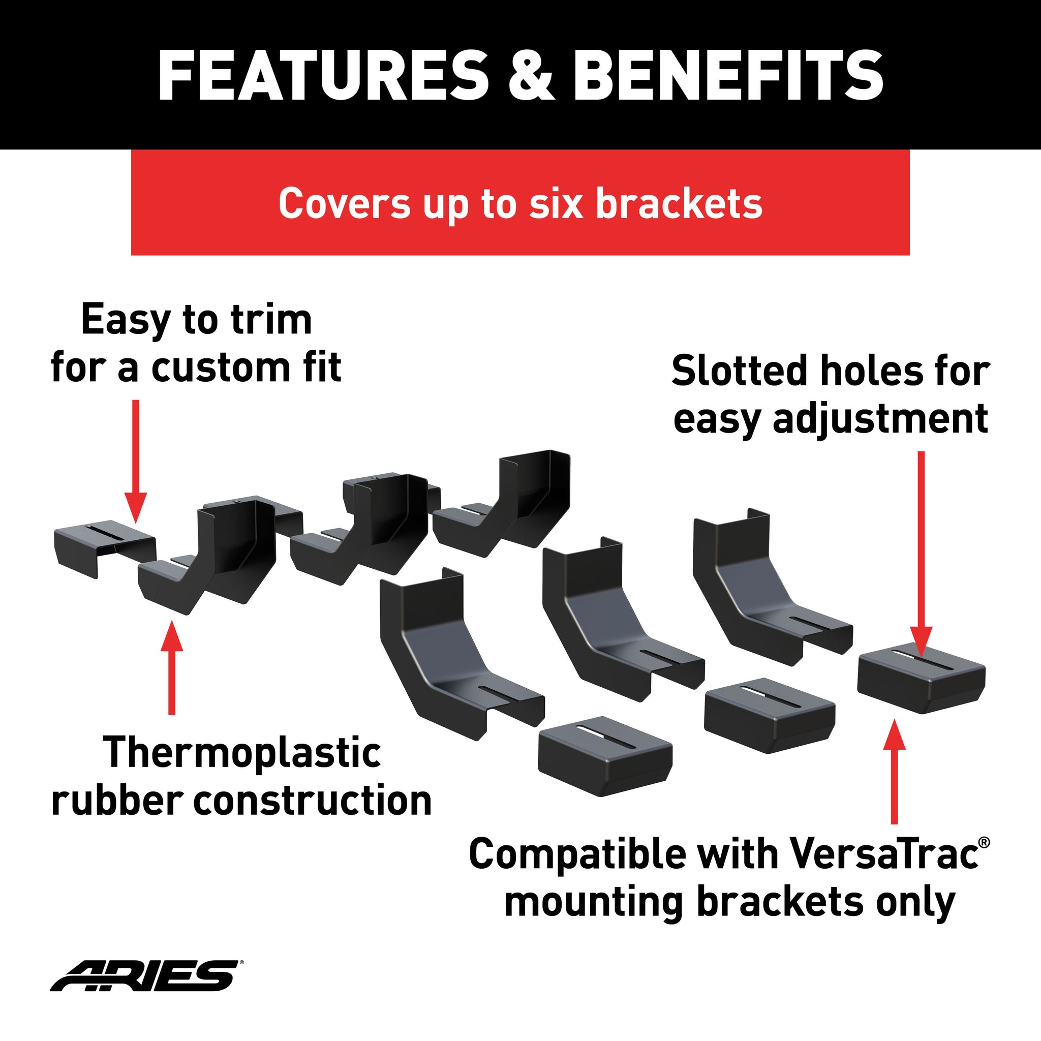 ARIES VersaTrac bracket covers add a finishing touch and extra protection to any ARIES running boards or side steps with the VersaTrac mounting system. The covers are designed to mount over the top of each bracket, giving the running board a more enhanced appearance. The covers are constructed from thermoplastic rubber to be strong and completely resilient to rust. The rubber helps protect the brackets from water, dirt and other elements, and it can easily be trimmed to accommodate any vehicle application. Installation of ARIES VersaTrac bracket covers is quick and easy. They feature slotted holes and utilize the existing mounting hardware on the running boards and running board brackets. The slotted holes allow for easy adjustments as needed. This package includes six bracket covers to accommodate extended cab applications and up to six mounting brackets. Packages of four and eight are also available for regular cab and crew cab.