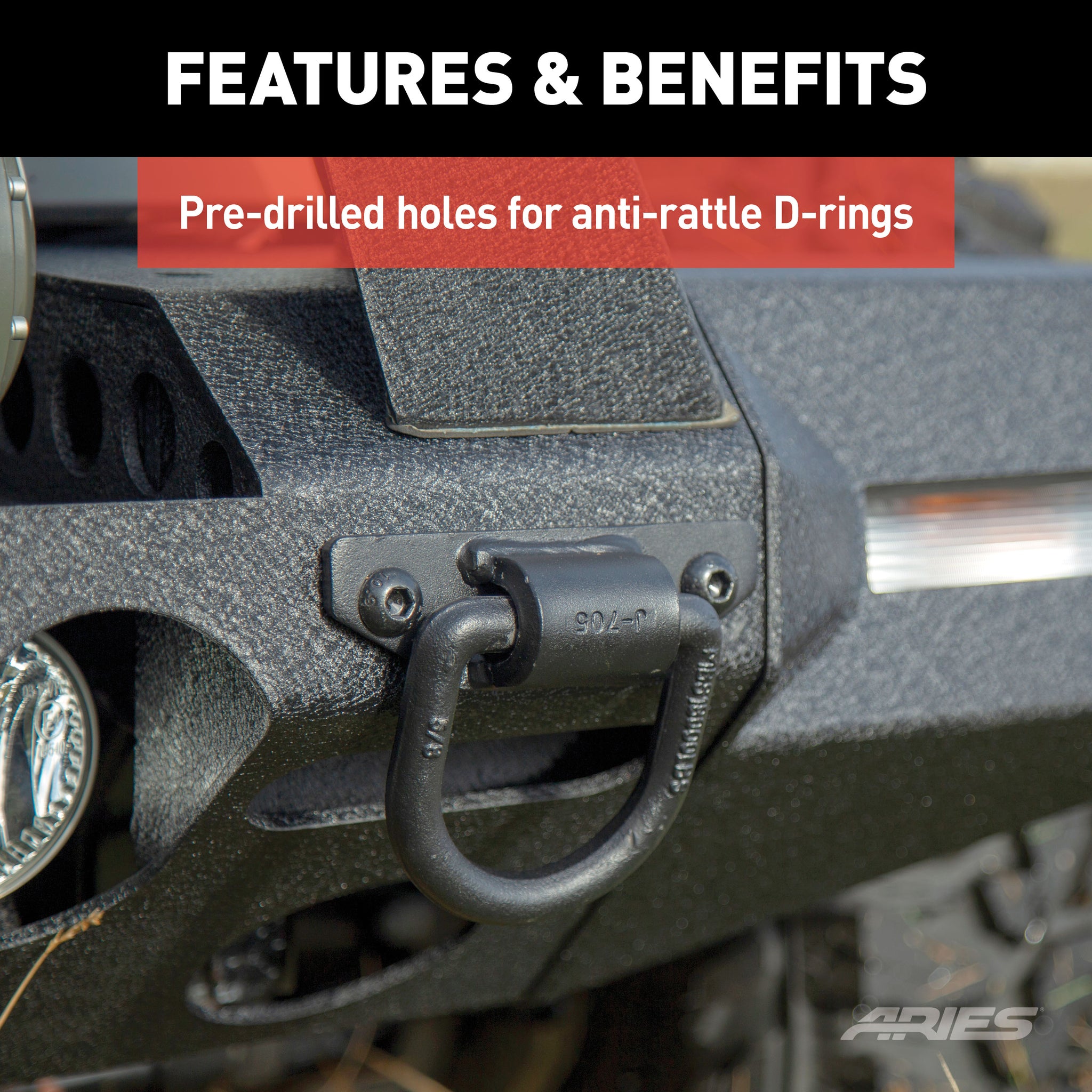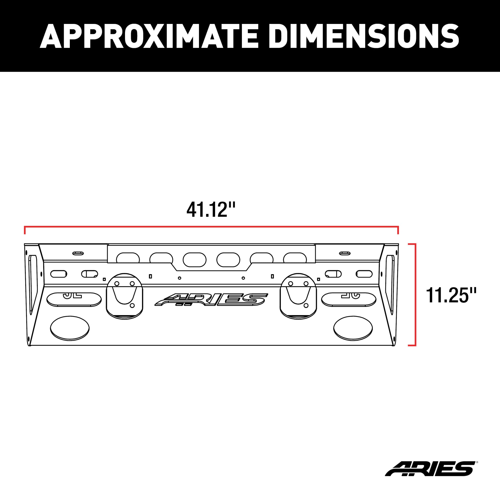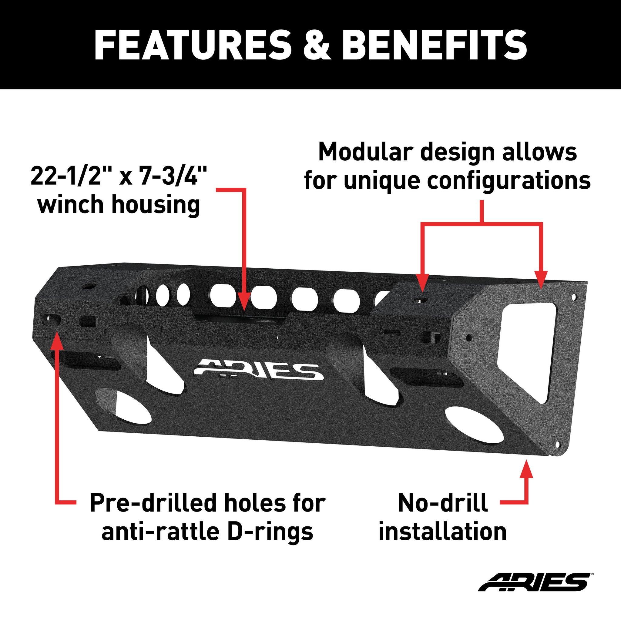 The ARIES TrailChaser Jeep bumper is unlike any other bumper for the Jeep Wrangler JL or Jeep Gladiator because it features a modular design. Each piece can be attached or swapped out as desired, giving you complete freedom of customization and a look that best characterizes your Jeep Wrangler. All TrailChaser bumpers are also compatible with a variety of accessories, including LED lights, D-rings, tow hooks and a winch. This particular piece includes the front-end center section only and is intended to accept corners and brush guards (sold separately). It is constructed from high-strength carbon steel and has a unique, textured black powder coat finish for maximum rust resistance. It is also available in lightweight, rust-free, powder-coated aluminum. This bumper center section features a standard 22-1/2" x 7-3/4" winch housing and is compatible with the ARIES winch adapter #2072100 for larger winches. It provides cutouts for lights and has pre-drilled holes for D-rings #2081300 and tow hooks #15600TW (lights and accessories not included). All ARIES TrailChaser bumpers install using pre-existing factory mounting points for fast, easy installation with no drilling required.
