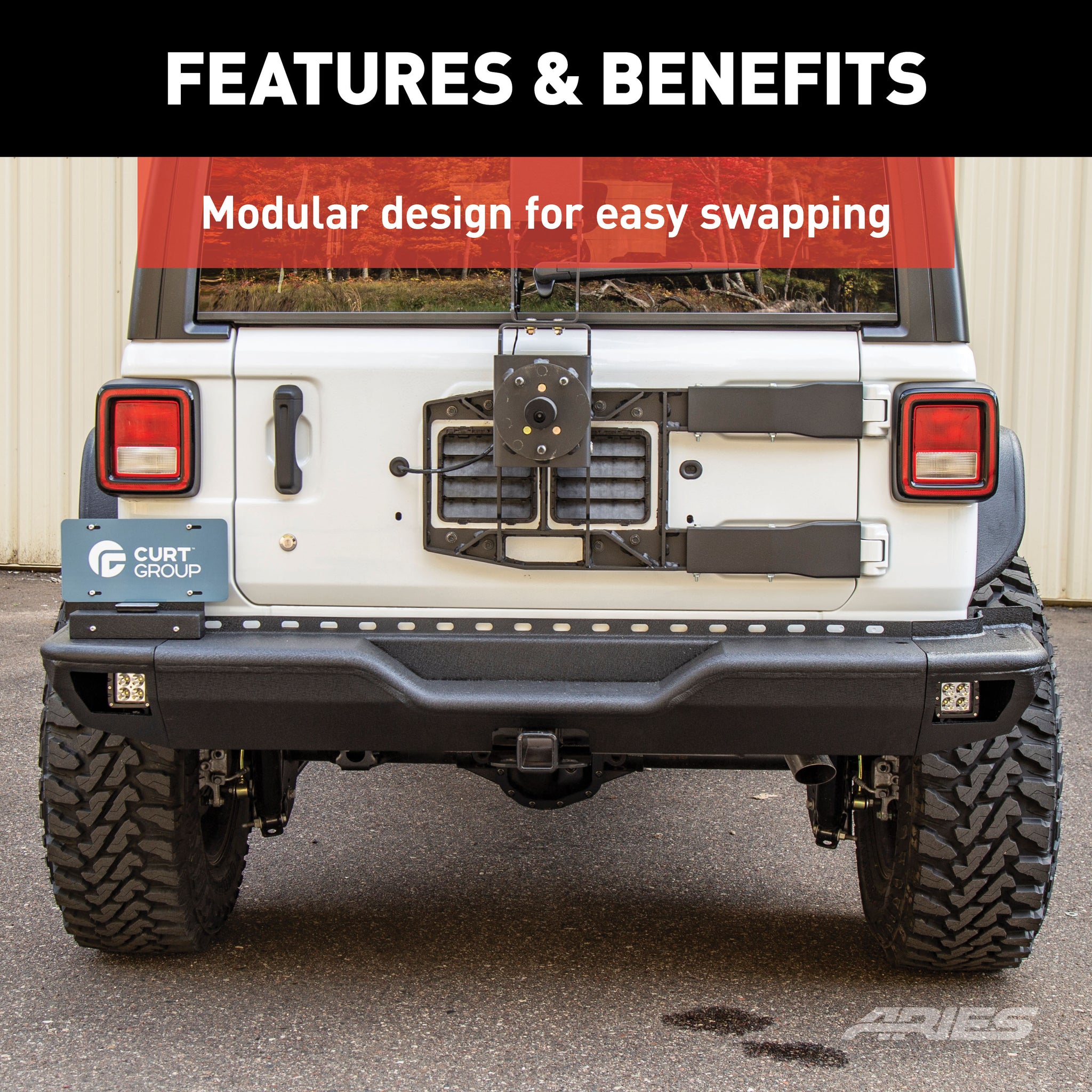 The ARIES TrailChaser Jeep bumper is unlike any other bumper for the Jeep Wrangler JL because it features a modular design. This particular bumper for the rear of the Jeep includes the center section and side extensions with integrated LED lights. It is constructed from high-strength carbon steel and has a unique, textured black powder coat finish for maximum rust resistance. It is also available in powder-coated aluminum. The bumper corners offer a professional finishing touch with their integrated LED lights. The 2" square work lights put out 2,200 lumens each and feature a flood beam pattern. They are made with grade-A LED chips, rust-free aluminum construction, an IP68-standard breather and dual heat sinks. They are also thoroughly tested and come with a waterproof wiring harness for easy installation. All ARIES TrailChaser bumpers install using pre-existing factory mounting points for fast, easy installation with no drilling required.
