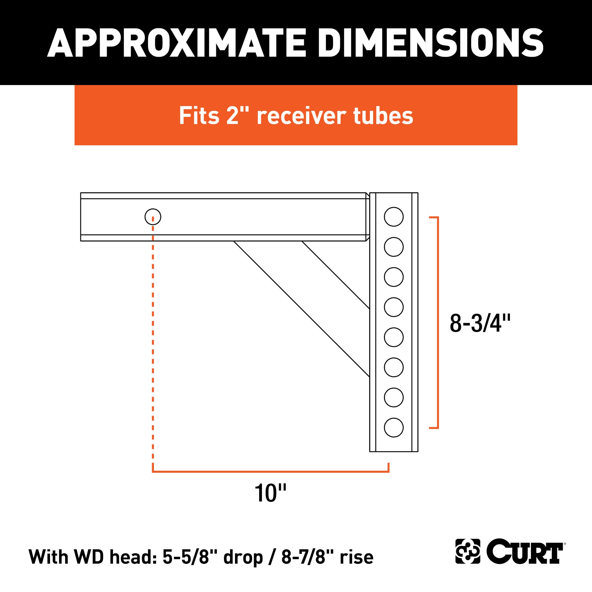 When it comes to enjoying your passion, we think towing equipment should never be the limiting factor. This CURT weight distribution replacement shank is designed for heavy-duty towing, versatile adjustment of your weight distribution hitch and long-lasting reliability. Made from high-strength steel and tested for safety, this WD replacement shank is perfect for a variety of tough jobs and long journeys. It is compatible with all CURT weight distribution hitches and has a 2" shank with a 5/8" hitch pin hole to fit any 2" x 2" receiver tube opening with a 5/8" hitch pin hole, including most CURT class 3, class 4 and Xtra Duty class 5 trailer hitches. While the receiver tube shank measures 2" x 2", the vertical shank offers a universal fit to be compatible with all CURT weight distribution hitches. Holes in the vertical shank are spaced 1-1/4" center-to-center and have a 3/4" diameter, allowing for flexible adjustment of the WD head for precise leveling of the vehicle-trailer combination. This weight distribution shank can be positioned in the rise position for a maximum rise of 8-7/8" or flipped into the drop position for a maximum drop of 5-5/8". To ensure durability and long-lasting use, CURT weight distribution replacement shanks are constructed from solid steel and shielded with a highly durable carbide black powder coat finish. This protects them from rain, snow, dirt, road salt and much more for lasting corrosion resistance.