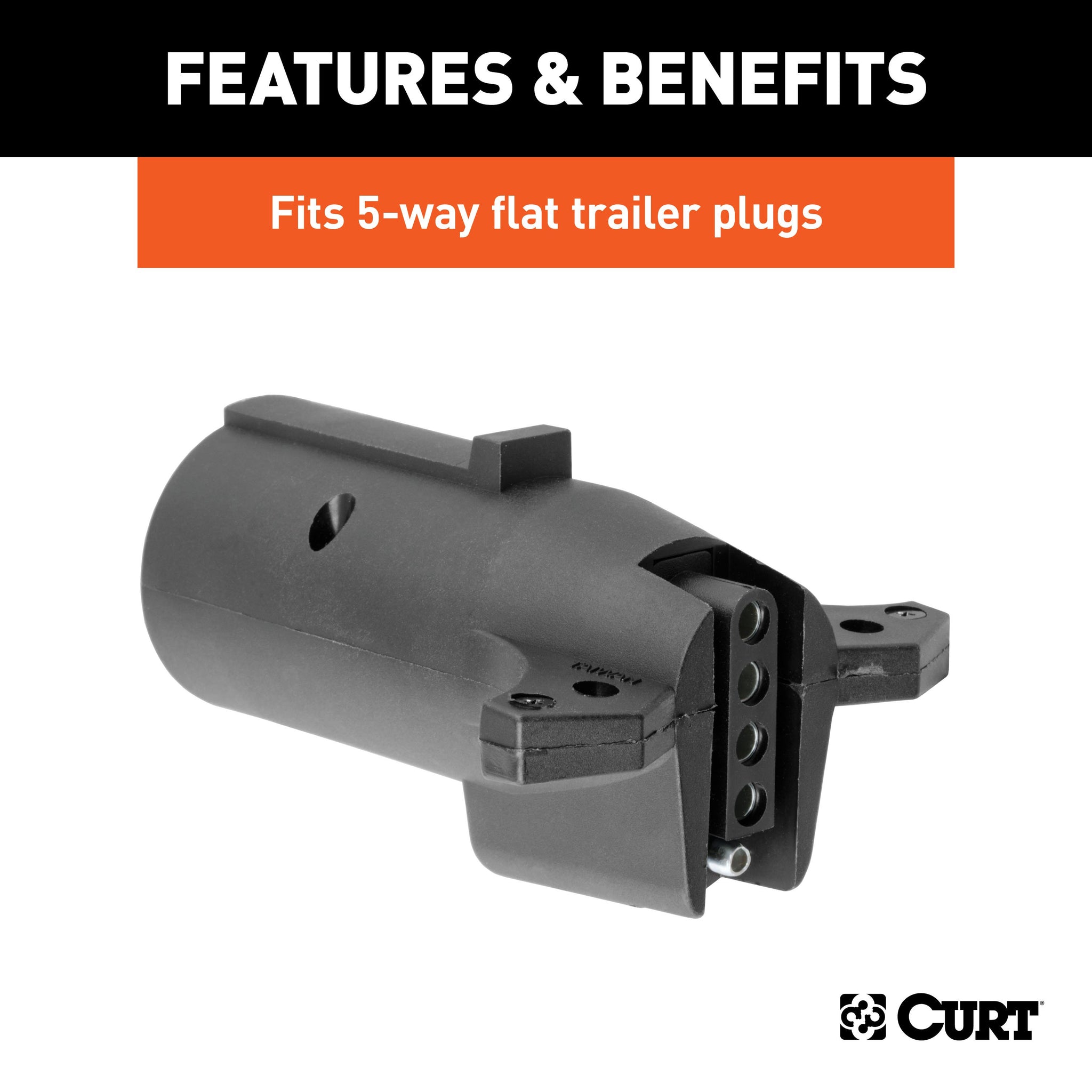 There are several different types of connectors used to supply power from a tow vehicle's electrical system to a trailer's wiring system. Some trailers only need the bare essentials -- running lights, brake lights and turn signals -- while others require a connection for reverse lights, electric brakes and auxiliary power. With connectors ranging from simple to complex, it may be the case that the connection between your vehicle and your trailer is not a perfect match. For example, your truck may be equipped with a 6-way round socket, but your trailer may have a 4-way flat plug. For this very common problem, CURT offers a quick and simple solution in the form of an electrical adapter. An adapter is an electrical device that allows a connection to be made between a mismatched trailer plug and vehicle socket. It easily plugs in your vehicle's electrical socket and usually requires no additional wiring. CURT offers an array of adapters to accommodate most types of plugs and sockets, including 4-way flat, 4-way round, 5-way flat, 6-way round, 7-way RV blades and more. This electrical adapter is designed to adapt a 7-way RV blade vehicle socket to fit a 5-way flat trailer plug. It features quality plastic construction and requires no splicing. All CURT wiring and electrical products come with a one-year limited warranty to give you the assurance you need to tow with confidence.