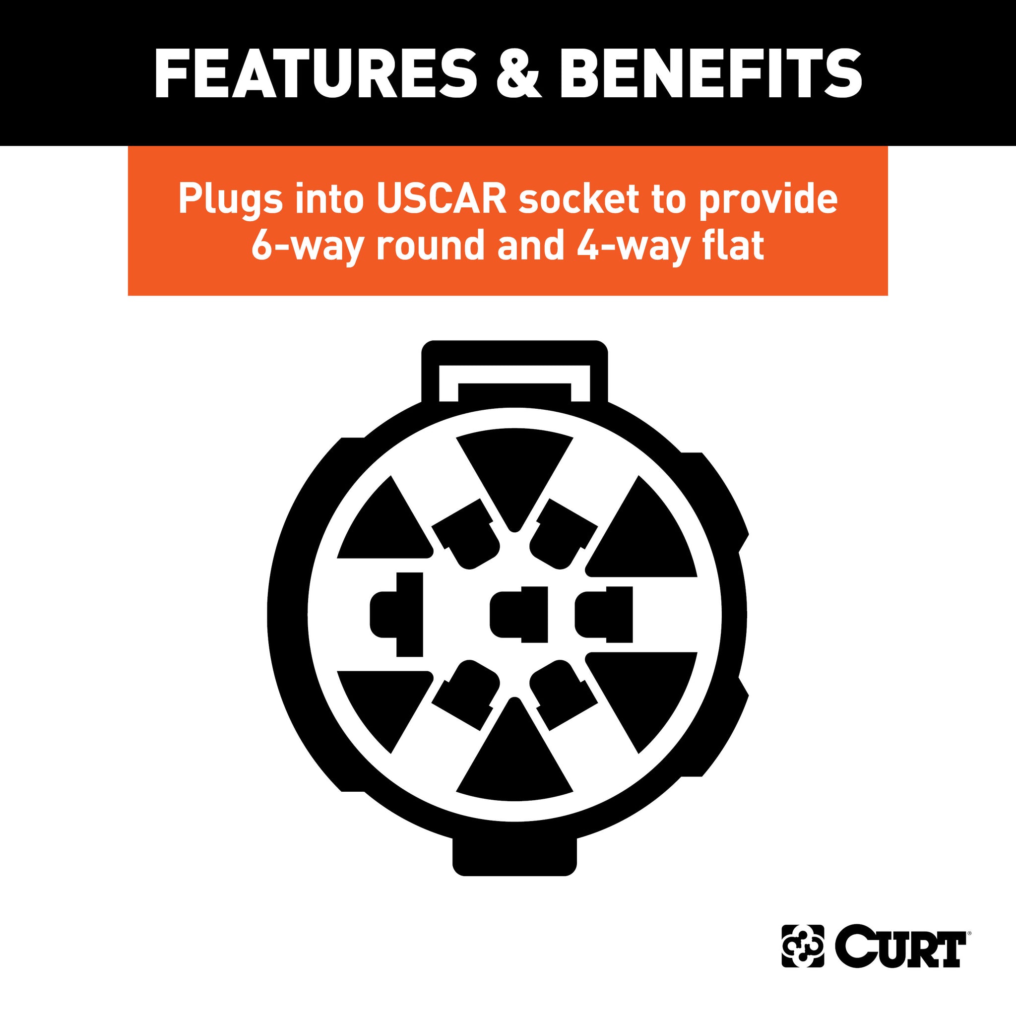 A CURT custom wiring connector (sometimes called a T-connector) is a simple, plug-and-play electrical device that eliminates the need for cutting, splicing and soldering when installing vehicle-to-trailer wiring. Most vehicles do not come ready to tow. Unless your vehicle has a towing package, it is probably not equipped with a trailer wiring connector. This is where CURT's custom wiring connectors come into play. A custom wiring connector uses a single original equipment plug to plug into a special socket provided by your vehicle. Though this option is not available on every vehicle, some automotive manufacturers design their vehicles to be easily equipped for towing by supplying a socket, integrated into the vehicle's electrical system, to readily accept a custom wiring connector. With a CURT custom wiring connector, there is no need to tap into the taillight assembly because a special socket is already provided. This special custom wiring connector actually provides two connector sockets for a multipurpose option. It plugs into an OEM USCAR connector and offers a 4-way flat and 6-way round connector (see application info to verify fitment with your vehicle). It also comes with a mounting bracket for easy installation. CURT custom wiring connectors are designed to be long-lasting and simple to install. They come with dust covers to keep your connector clean when not in use.