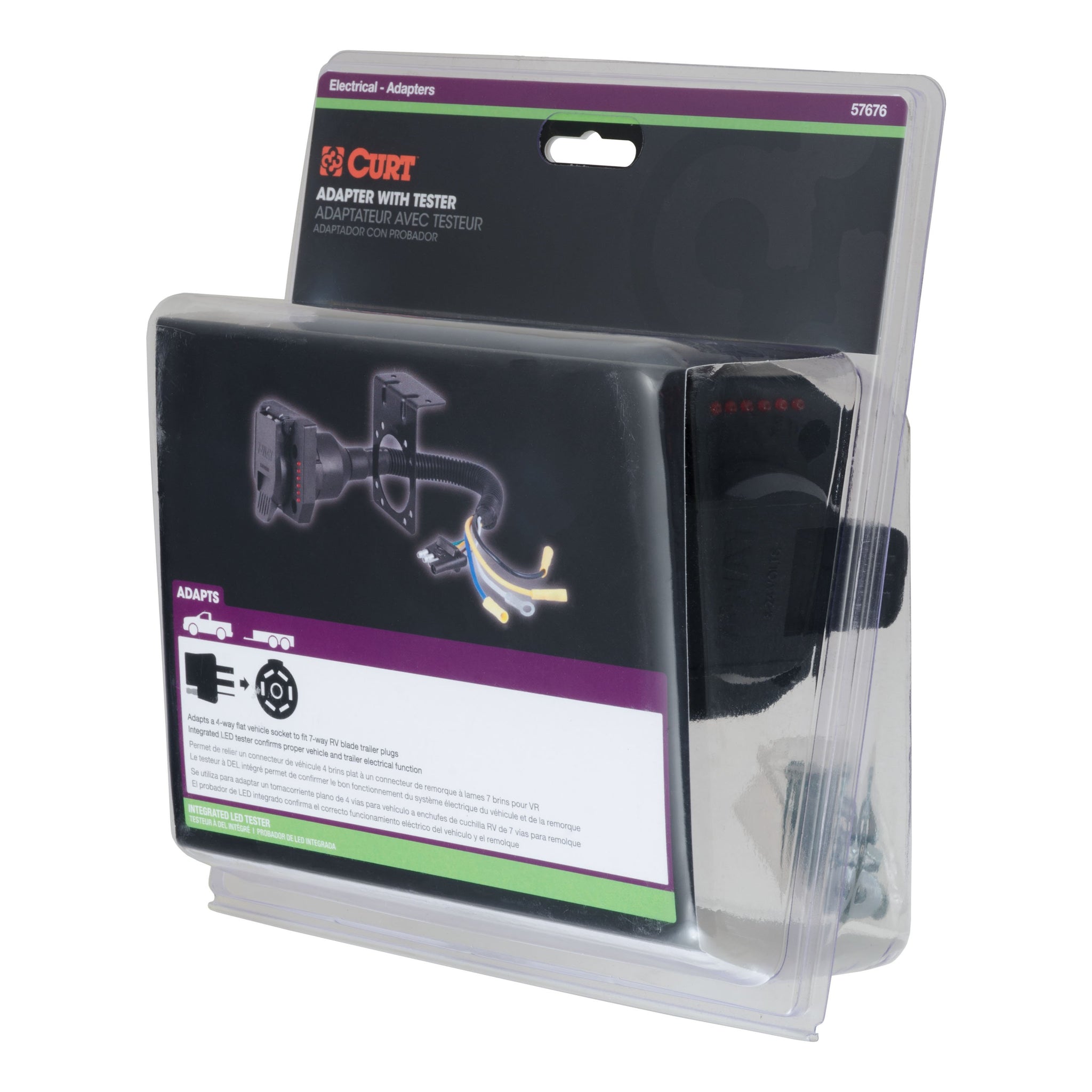 There are several different types of connectors used to supply power from a tow vehicle's electrical system to a trailer's wiring system. Some trailers only need the bare essentials -- running lights, brake lights and turn signals -- while others require a connection for reverse lights, electric brakes and auxiliary power. With connectors ranging from simple to complex, it may be the case that the connection between your vehicle and your trailer is not a perfect match. For example, your truck may be equipped with a 6-way round socket, but your trailer may have a 4-way flat plug. For this very common problem, CURT offers a quick and simple solution in the form of an electrical adapter. An adapter is an electrical device that allows a connection to be made between a mismatched trailer plug and vehicle socket. It easily plugs in your vehicle's electrical socket and usually requires no additional wiring. CURT offers an array of adapters to accommodate most types of plugs and sockets, including 4-way flat, 4-way round, 5-way flat, 6-way round, 7-way RV blades and more. This electrical adapter is designed to adapt a 4-way flat vehicle socket to fit a 7-way RV blade trailer plug. Some manual wiring is required. It comes with an integrated electrical tester, a mounting bracket and all necessary hardware for a complete installation. All CURT wiring and electrical products come with a one-year limited warranty to give you the assurance you need to tow with confidence.