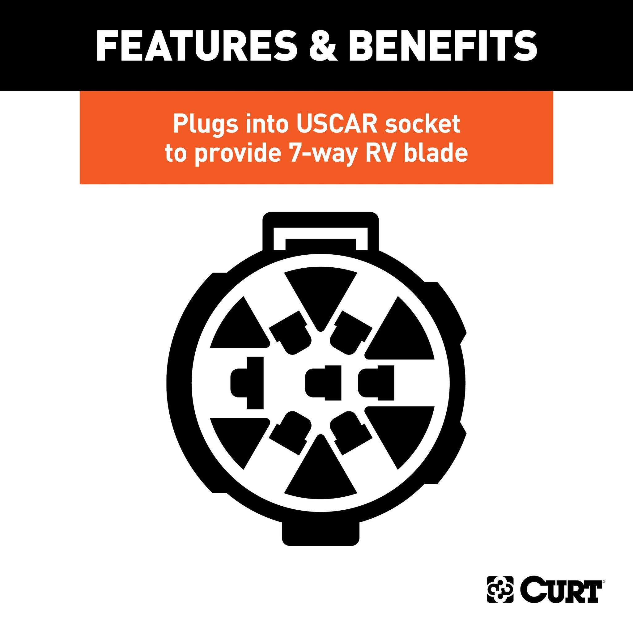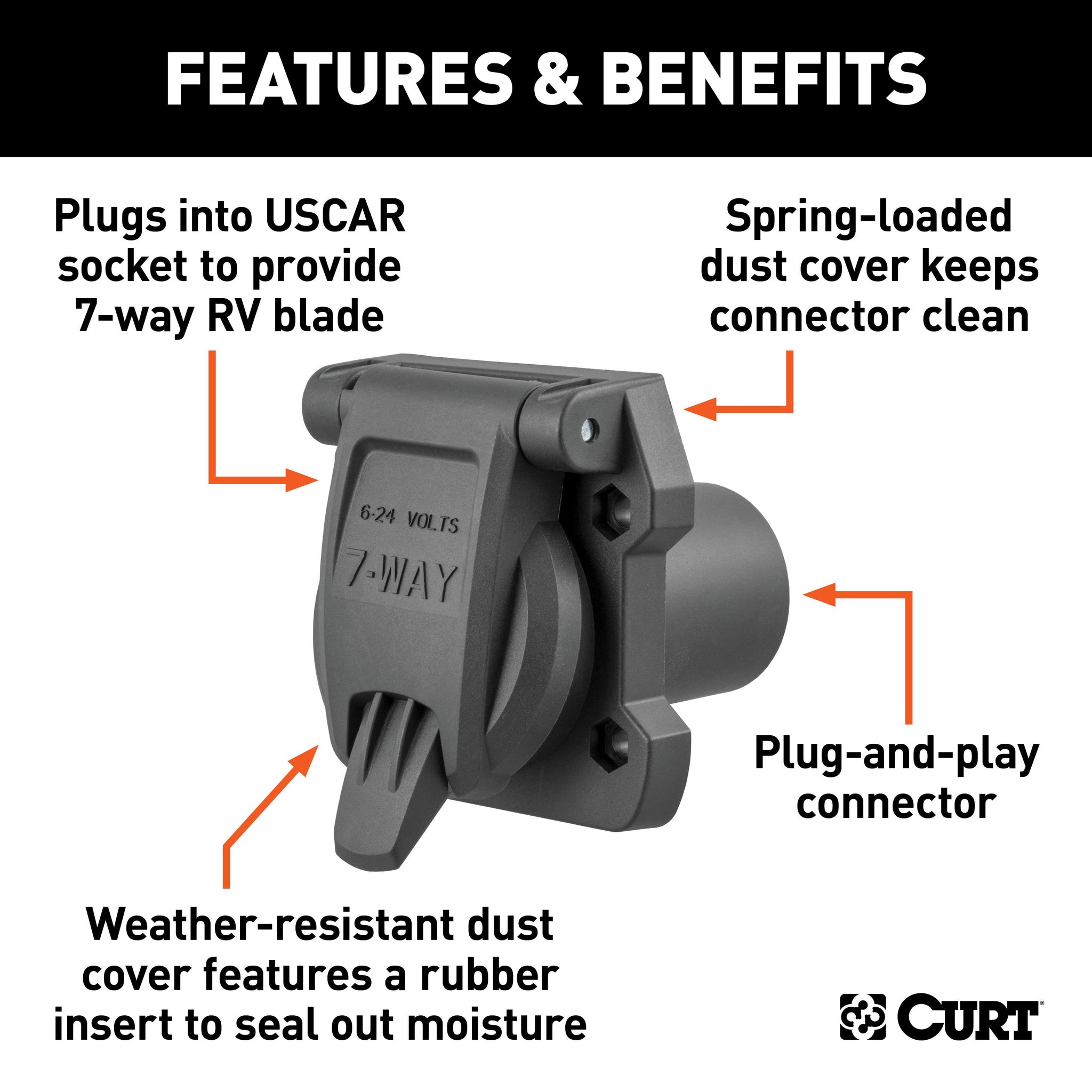 Like trailer hitches and ball mounts, electrical connectors range all over the board in shape, size and capability, but no matter what your trailer's electrical functions are, you need a solid connection to keep the power flowing and ensure safety on the road. CURT electrical connectors are designed and manufactured to give you a reliable connection every time you plug in your trailer. This 7-way RV blade connector is designed to plug into a USCAR socket and supply power for tail lights, turn signals, electric trailer brakes, a 12-volt battery, reverse lights and brake lights, as well as a ground connection. It is intended to be a replacement trailer wiring connector, plugging into a standard USCAR socket (see application info to verify fitment with your vehicle). It features rust-free black plastic construction and comes with a spring-loaded cover to keep out dust and water. This 7-way RV blade connector is a female-end socket, specifically designed for the vehicle side of the connection (see application info to verify fitment with your vehicle).