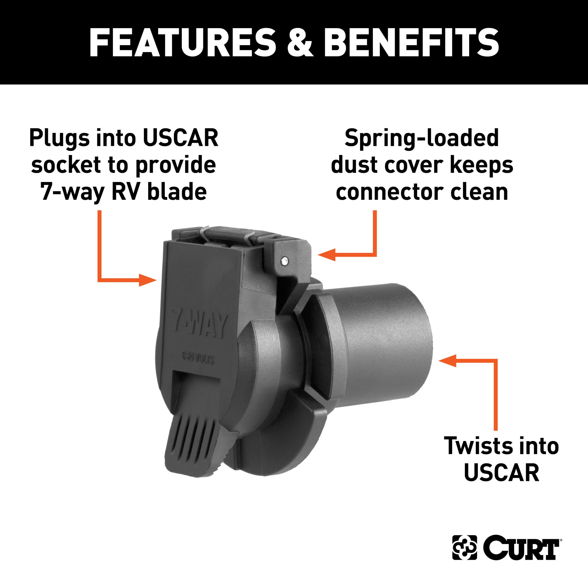 Like trailer hitches and ball mounts, electrical connectors range all over the board in shape, size and capability, but no matter what your trailer's electrical functions are, you need a solid connection to keep the power flowing and ensure safety on the road. CURT electrical connectors are designed and manufactured to give you a reliable connection every time you plug in your trailer. This 7-way OEM USCAR replacement connector is designed to plug into a twist-in OEM vehicle socket and supply power for tail lights, turn signals, electric trailer brakes, a 12-volt battery, reverse lights and brake lights, as well as a ground connection. It features rust-free black plastic construction and comes with a spring-loaded cover to keep out dust and water. This 7-way RV blade connector is a female-end socket, specifically designed for the vehicle side of the connection (see application info to verify fitment with your vehicle).