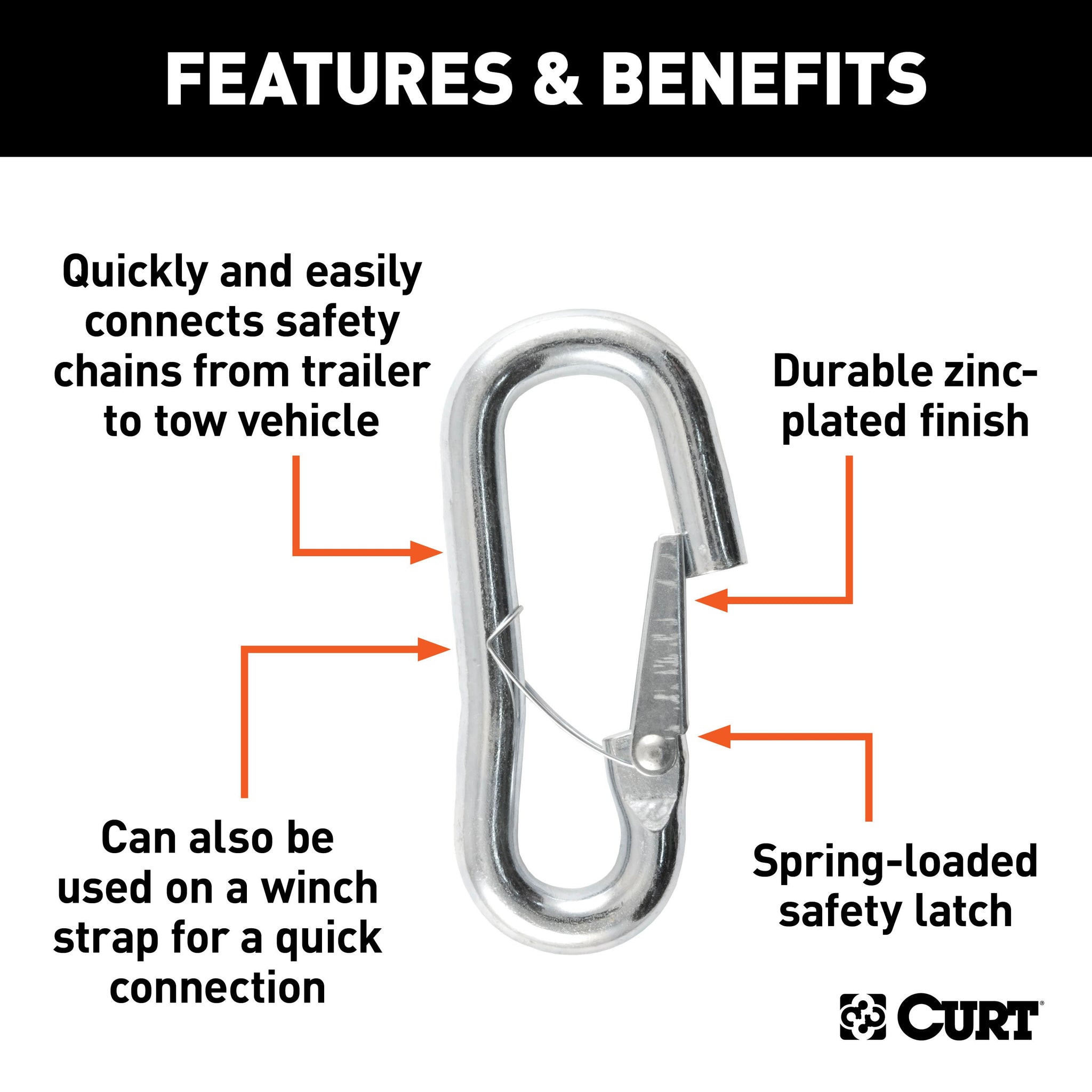There are always some factors on the road you cannot control -- an irresponsible driver, adverse weather conditions -- but one thing you can control is the type of towing equipment you use. Just because there are threats out there, doesn't mean your towing adventures need to be dangerous. CURT offers a variety of towing safety products -- including safety chains, safety cables, hooks, links and more -- to make sure you have confidence to Bring It and trustworthy equipment to Bring It safely. CURT snap hooks are a highly secure way to connect your safety chains from your trailer to your tow vehicle. They feature a spring-loaded safety latch that turns the hook into a closed loop. Similar to a quick link, the safety latch allows for a safety chain connection that won't come loose from vehicle vibrations or jarring on uneven terrain. Snap hooks also feature a strong steel construction and come with a zinc-plated finish to outlast the elements. This particular snap hook has a 9/16" diameter and offers a gross trailer weight capacity of 5,000 lbs. Remember, when attaching safety chains, the chains should be cross underneath the trailer coupler, and each hook and chain must be rated to meet or exceed the gross weight of the trailer.