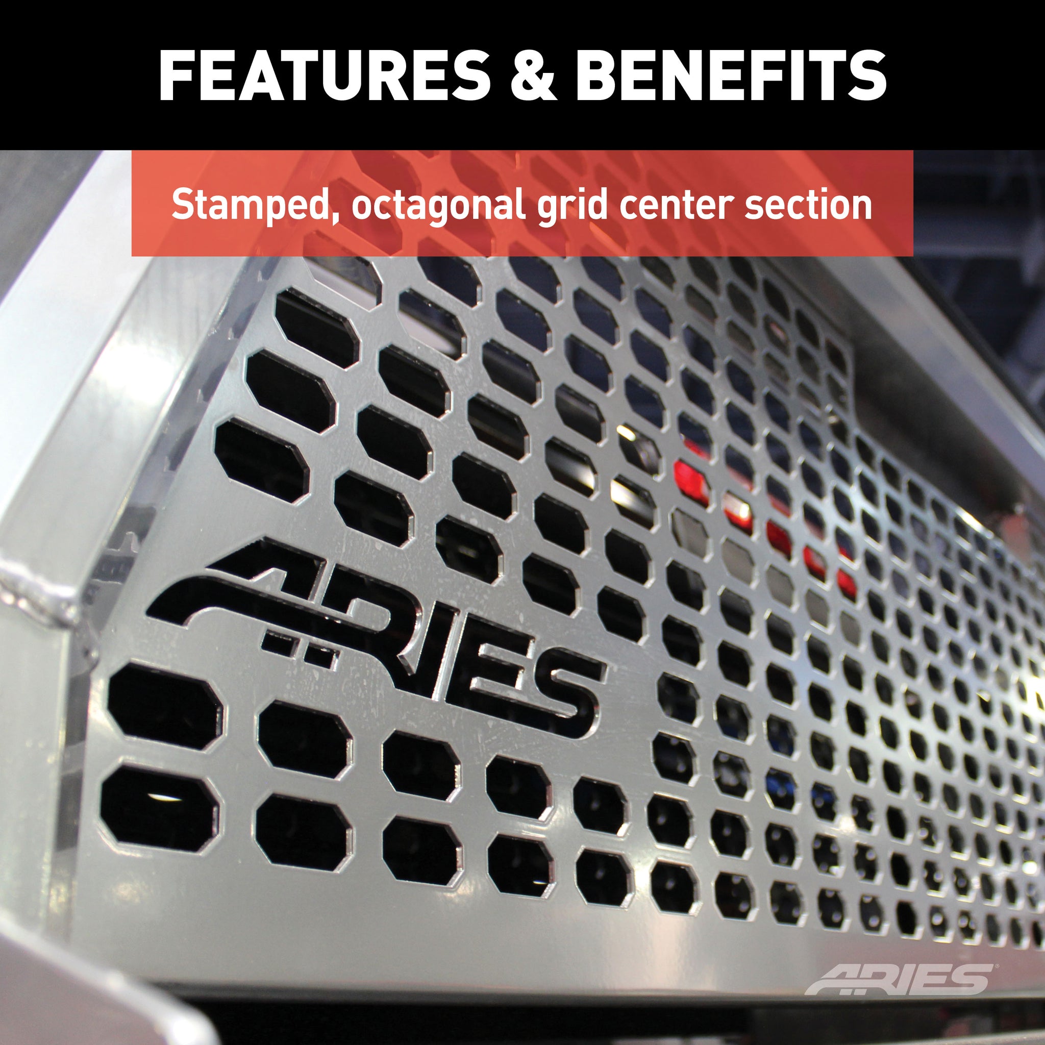 There are a lot of trucks out there, and setting yourself apart means going outside the lines, thinking outside the box and living life on the edge. The ARIES AdvantEDGE headache rack offers a unique look and extra protection for your pickup truck. It is distinguished by two key features: an eight-sided tube profile and an all-aluminum construction. Armed with a rock-solid mounting system, an octagonal grid center section and two finish options, the AdvantEDGE headache rack has your back. The all-aluminum construction allows it to protect your truck cab and easily resist the elements. Unlike the more common round and square tube frames of most headache racks, it is built with an octagonal tube profile. This not only supplies it with strength but also offers a look that better complements the style of modern pickup trucks. Because it is made entirely from aluminum, the AdvantEDGE headache rack is also very lightweight and completely resilient to rust. The AdvantEDGE headache rack also features a unique dual track system along the top edge. This provides a flexible mounting point for aftermarket lights, such as an LED light bar, as well as tie-down anchors and other accessories. The AdvantEDGE headache rack is available in two finish options -- carbide black powder coat or chrome powder coat -- for a custom look to complement the style of your truck. Installation is easy with its patented anchoring system. The stake pocket mounting system anchors to the walls of your truck bed with no drilling required, and it provides dependable strength and rigidity for the headache rack. This AdvantEDGE headache rack fits specific years of the Ford F250 Super Duty, F350 Super Duty and F450 Super Duty (see application info to verify fitment). It also complements other AdvantEDGE accessories, including the AdvantEDGE bull bar and AdvantEDGE side bars.
