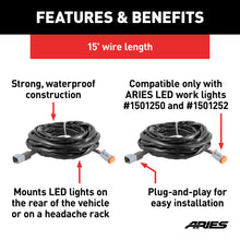 ARIES LED lights are made to shine bright, last long and take a beating. Each light boasts grade-A Cree LED chips, an IP68-standard breather, waterproof aluminum construction, a 50,000+ hour lifespan and a pedigree of thorough testing and certifications. These wiring extension harnesses offer a reliable, waterproof connection for a pair of LED work lights. They are ideal for mounting LED lights on the rear of the vehicle or on a headache rack. They each measure 15 feet long and are specifically designed for use with ARIES 2" square work lights #1501252 or flush-mount work lights #1501250 (two harnesses included).