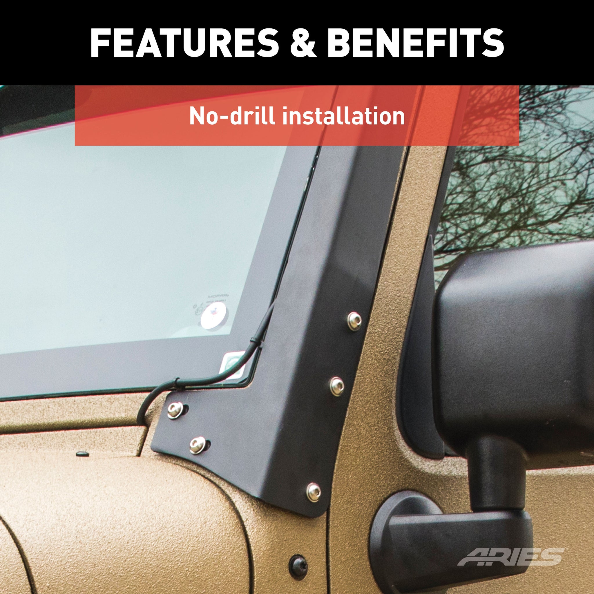 ARIES Jeep roof light mounting brackets allow you to mount a 50" LED light bar above your windshield, lighting the way on the trail and making your Jeep Wrangler stand out from the pack. These LED light bar mounting brackets feature stainless steel construction with a durable powder coat finish to provide maximum rust resistance and easily outlast the elements. They also feature removable stainless steel cover plates that allow for easier access to the light bar mounting hardware during installation. With the cover plates bolted into place, the light bar hardware is protected and hidden from view for added security and a more integrated look. ARIES Jeep light brackets are fast and easy to install, using factory mounting points on the Jeep JK to eliminate the need for drilling. Once installed, the roof light brackets accept the included ARIES 50" double-row LED light bar #1501278. The light bar is built with grade-A Cree LED chips, an IP68-standard breather and provides a 24,000-lumen, combo beam pattern. These roof light mounting brackets can also be purchased with an included center crossbar that spans the width of the windshield and provides a mounting point for multiple smaller light bars or work lights (see part #15914).