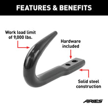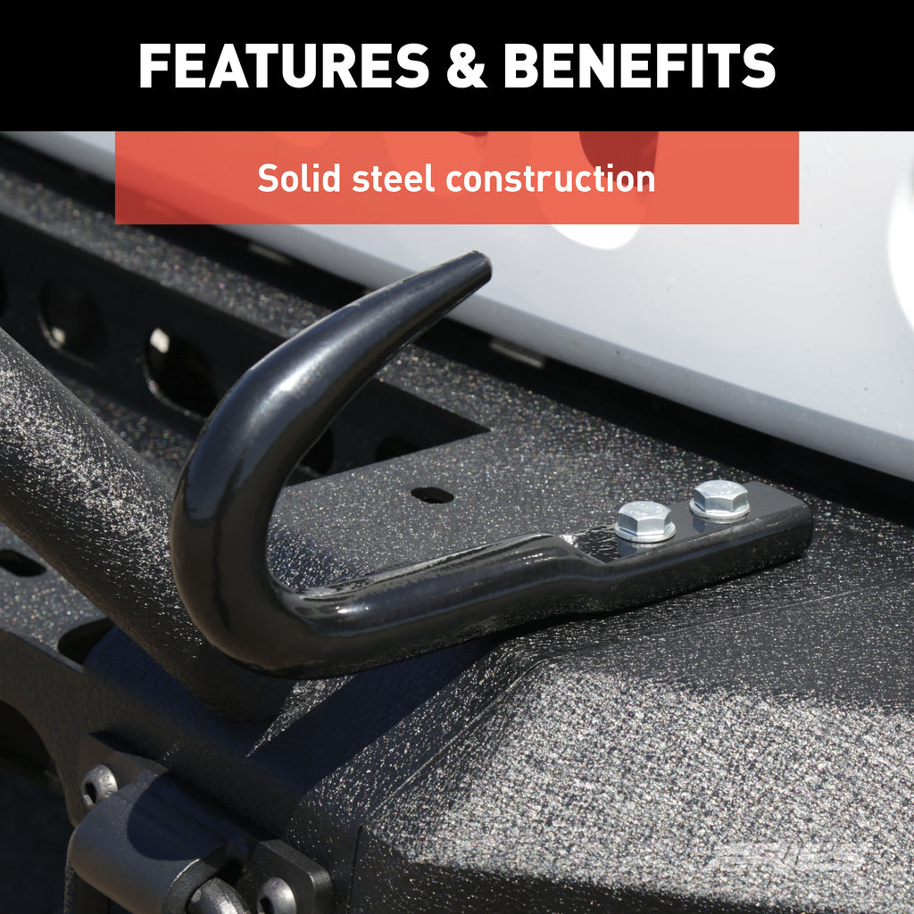 For added utility on your truck, SUV or Jeep, this tow hook easily bolts into place and features a work load limit up to 9,000 lbs. (limited to the capacity of the mounting structure). It is constructed from solid steel and covered in a durable black powder coat finish for excellent rust resistance. This tow hook is specifically designed for use on ARIES TrailChaser Jeep bumpers but can be mounted on virtually any bumper or other front-end accessory. It also provides a vehicle-specific fit on Jeep Wrangler YJ and TJ models, utilizing the existing factory bolts for installation.