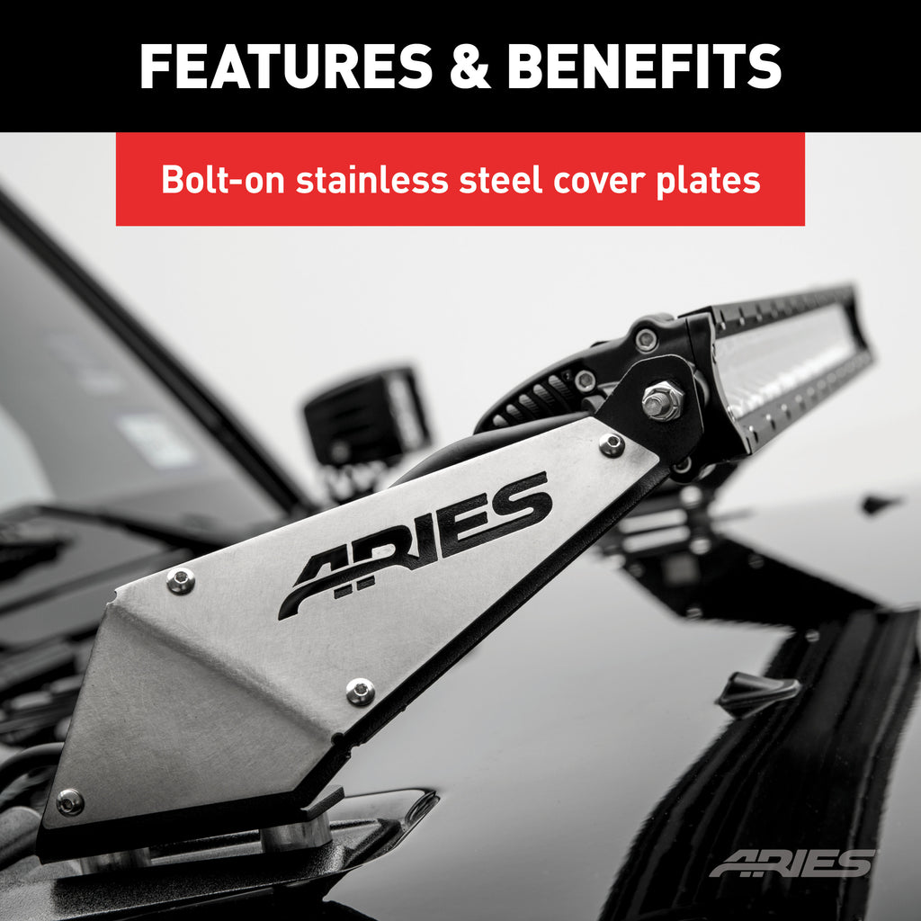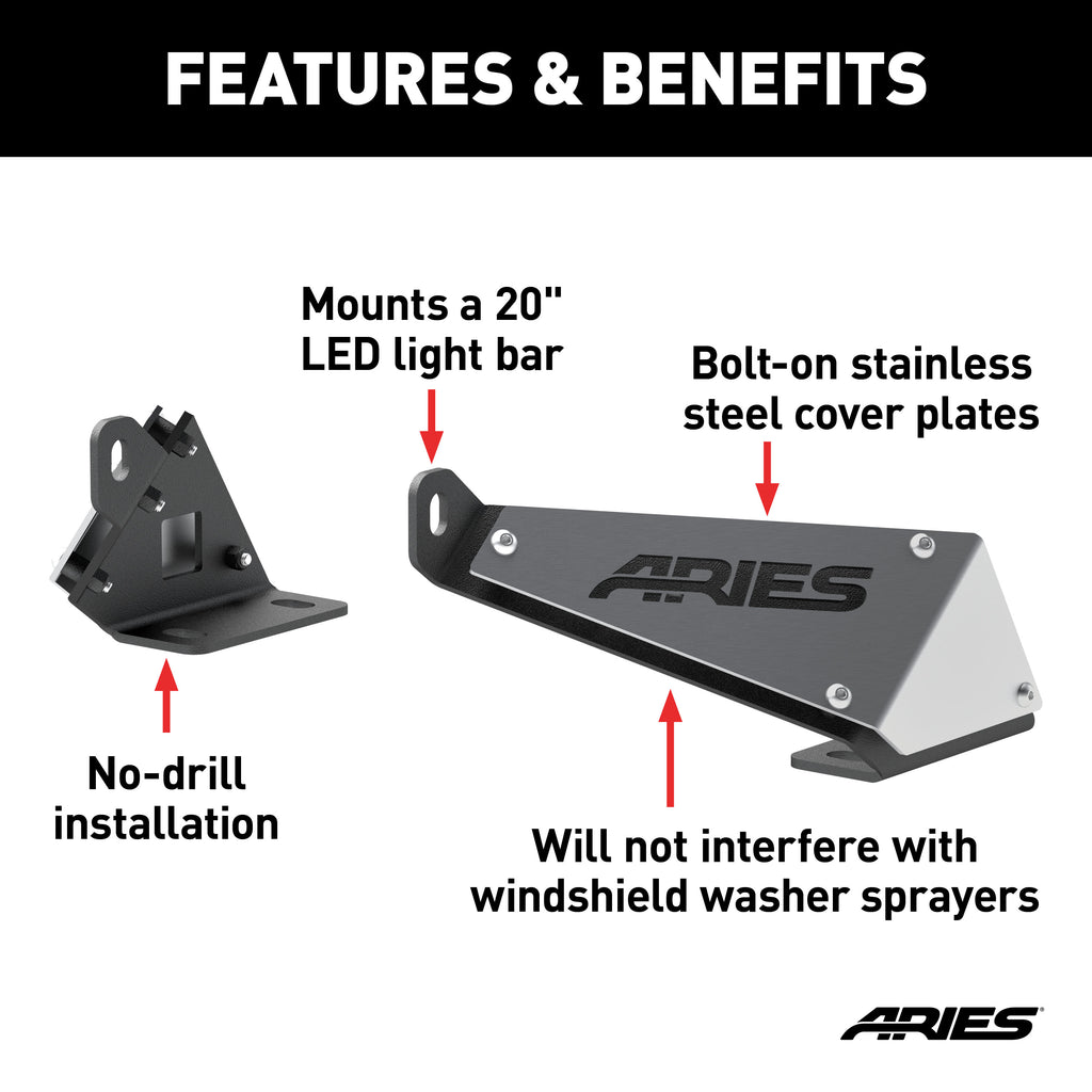 There is a sense of possibility unlike any other that comes every time you grip the wheel of your Wrangler and throw the transmission into drive. For shedding a little extra light on the trail and standing out from the rest of the herd, ARIES Jeep hood light mounting brackets are the accessory of choice. They mount quickly and easily on the hood of the Jeep Wrangler JK, using factory mounting points, and accept an LED light bar up to 20" long (ARIES 20" single-row LED light bar #1501262 recommended). Because they use existing mounting locations, there is no drilling necessary, and the brackets will not interfere with the factory windshield washer sprayers. To easily outlast rust and keep your Jeep JK looking like a pro, these LED light bar mounting brackets are made from stainless steel and are shielded in a carbide black powder coat finish.