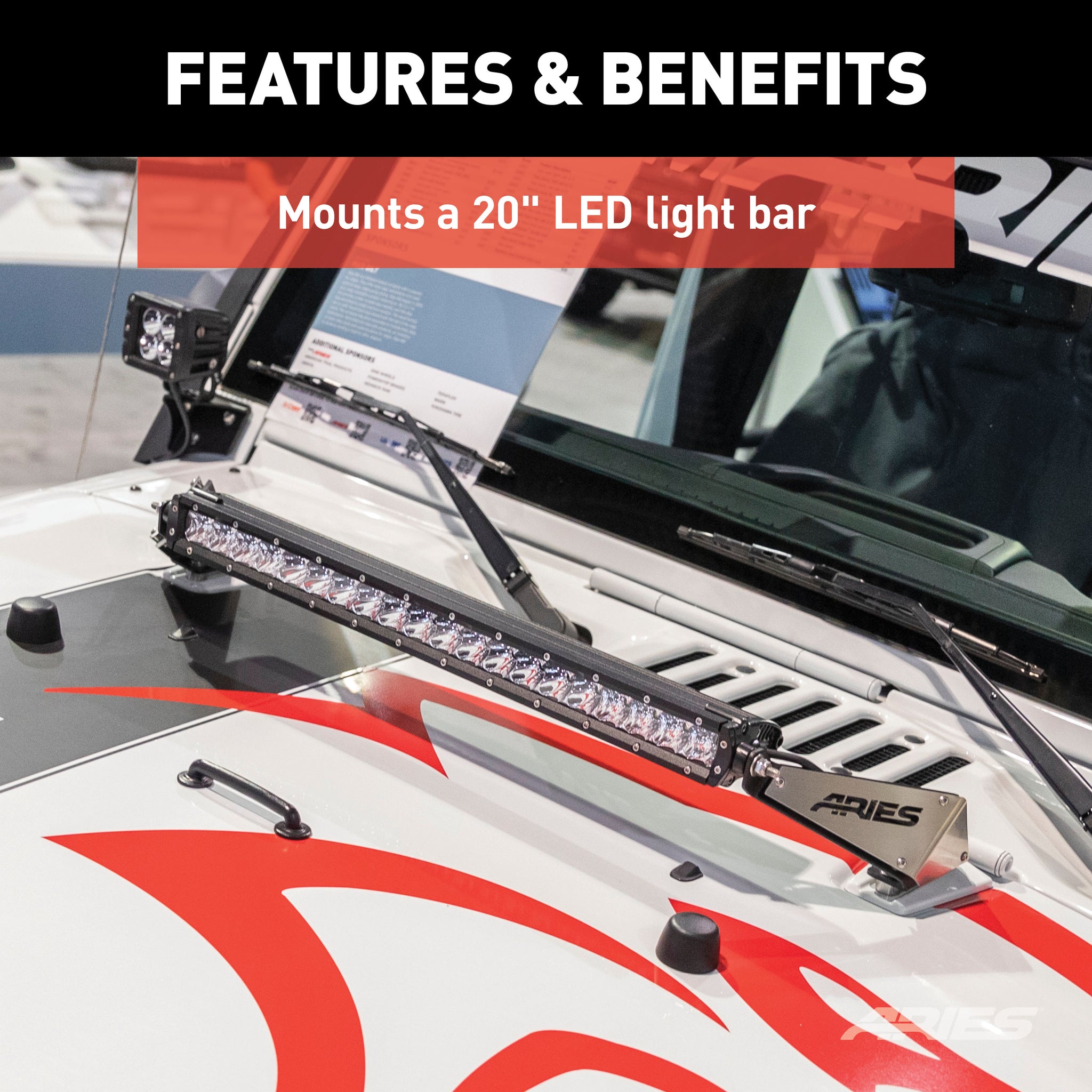 - Mounts a 20" LED light bar on the Jeep JK hood (#1501262 recommended)