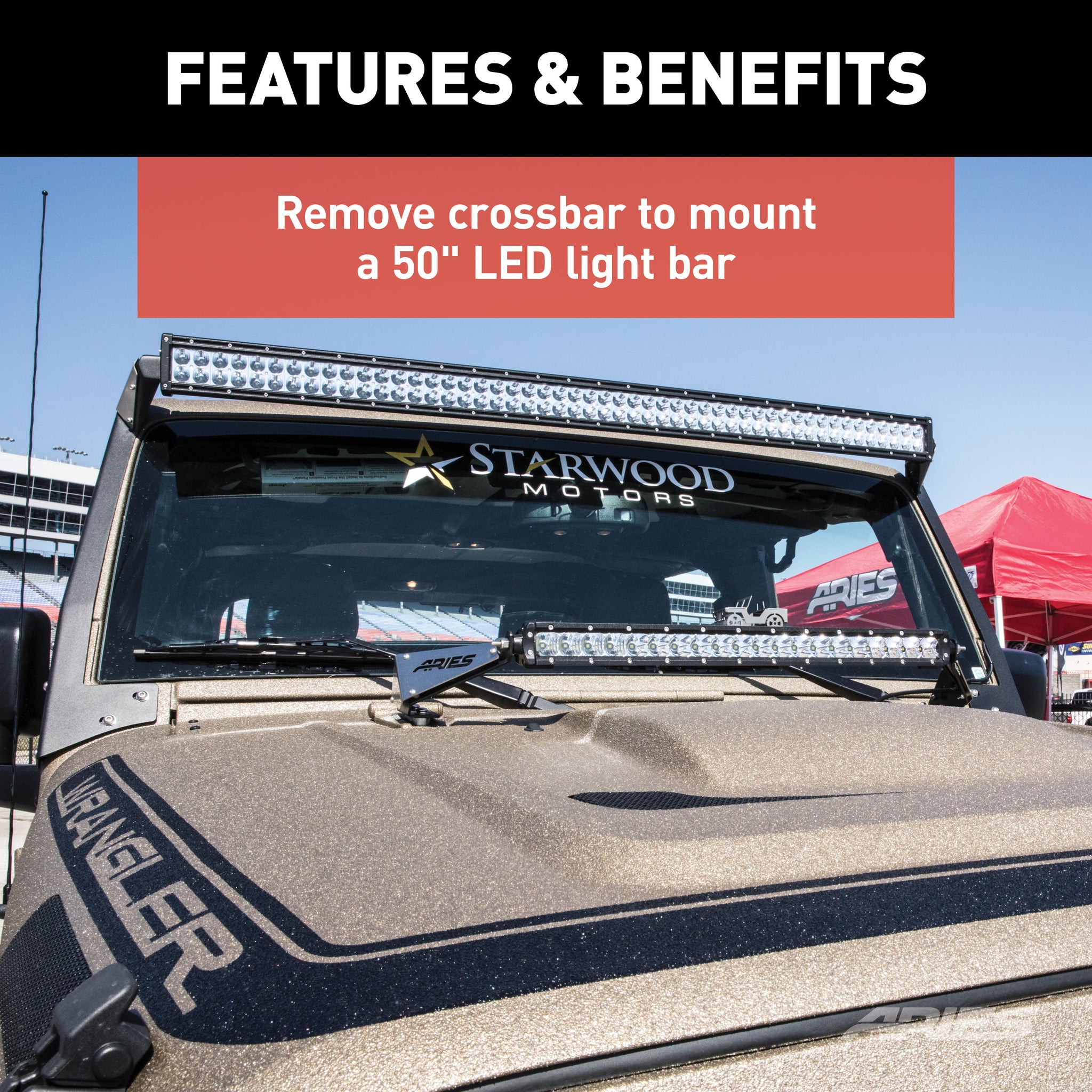 ARIES Jeep roof light mounting brackets allow you to mount an LED light bar up to 50" long above your windshield, lighting the way on the trail and making your Jeep Wrangler stand out from the pack. These LED light bar mounting brackets feature stainless steel construction with a durable powder coat finish to provide maximum rust resistance and easily outlast the elements. They also feature removable stainless steel cover plates that allow for easier access to the light bar mounting hardware during installation. With the cover plates bolted into place, the light bar hardware is protected and hidden from view for added security and a more integrated look. ARIES Jeep light brackets are fast and easy to install, using factory mounting points on the Jeep JK to eliminate the need for drilling. Once installed, the roof light brackets and slotted center crossbar can accept multiple smaller light bars or work lights up to 50" in total length. The center crossbar can also be removed to mount a full 50" light bar (ARIES 50" double-row LED light bar #1501278 recommended).