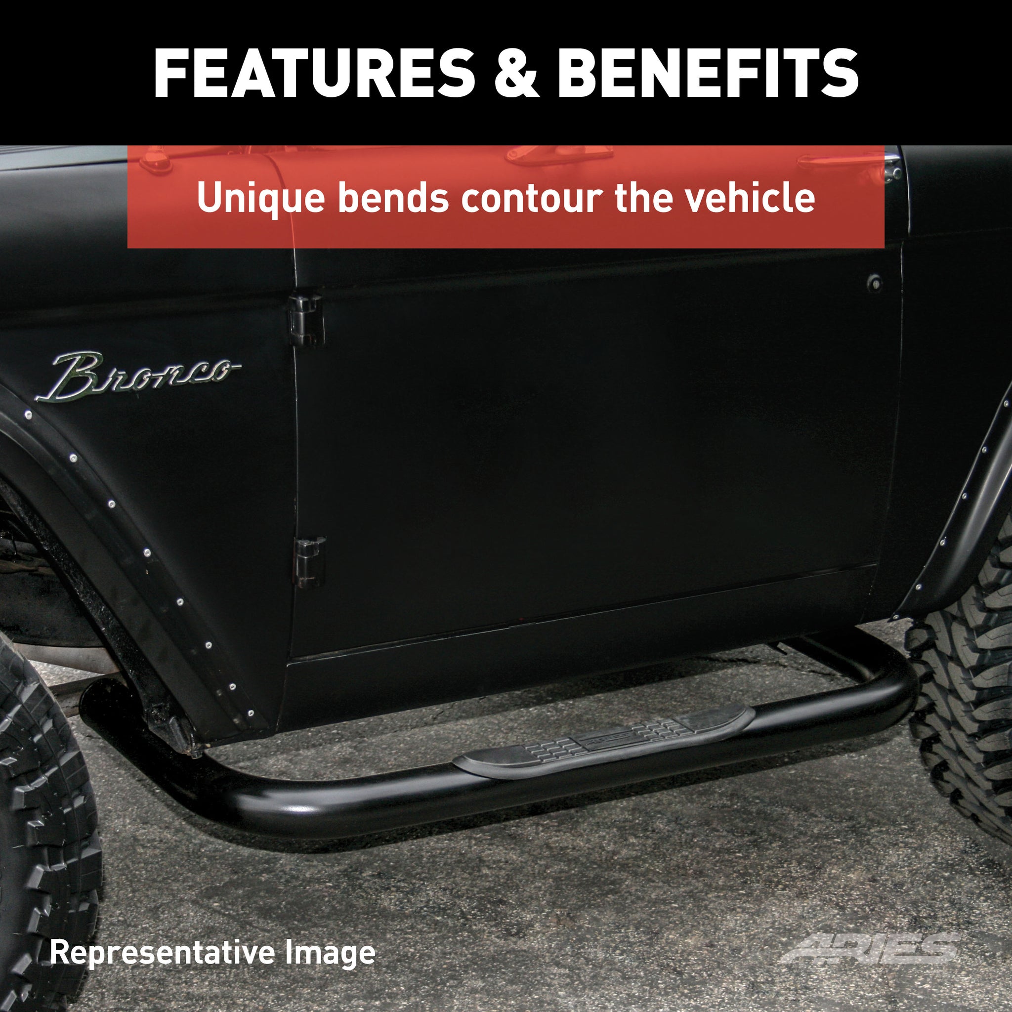 ARIES 3" side bars are more than a fancy decal for your truck, Jeep or SUV. They are a confident first step on each new adventure. These 3" nerf bars are constructed from strong carbon steel for superior rigidity, and they feature a sleek semi-gloss black powder coat finish. For an added edge, each nerf bar also goes through an E-coat process, before receiving its black powder coat, to strengthen and protect the final finish against peeling, chipping and scratching. ARIES 3" round side bars are also available in polished stainless steel or semi-gloss black powder-coated steel. All ARIES 3" nerf bars come with heavy-duty steel brackets and non-skid step pads. The mounting brackets are strong and custom-designed for specific makes and models to allow the side bars to contour to the lines of your vehicle. They offer easy installation and the strength necessary to provide sound footing. These particular custom nerf bars fit specific years of the Ford F150 (see application info to verify fitment). ARIES 3" round side bars also come with non-skid step pads made of tough polypropylene. These step pads feature a textured pattern for enhanced safety, and they cover a wide portion of the tubes for a more comfortable step.