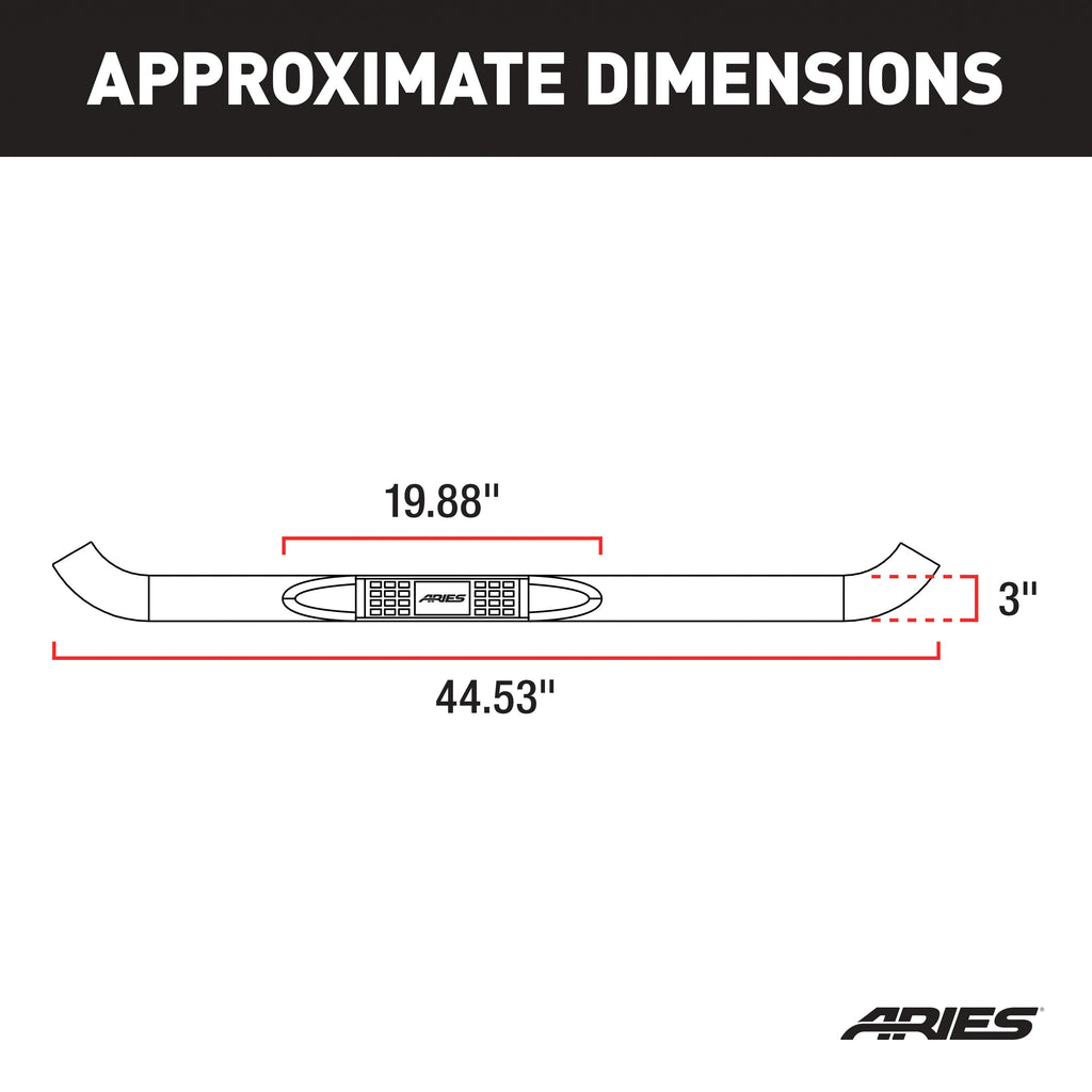 ARIES 3" side bars are more than a fancy decal for your truck, Jeep or SUV. They are a confident first step on each new adventure. These 3" nerf bars are constructed from strong carbon steel for superior rigidity, and they feature a sleek semi-gloss black powder coat finish. For an added edge, each nerf bar also goes through an E-coat process, before receiving its black powder coat, to strengthen and protect the final finish against peeling, chipping and scratching. ARIES 3" round side bars are also available in polished stainless steel or semi-gloss black powder-coated steel. All ARIES 3" nerf bars come with heavy-duty steel brackets and non-skid step pads. The mounting brackets are strong and custom-designed for specific makes and models to allow the side bars to contour to the lines of your vehicle. They offer easy installation and the strength necessary to provide sound footing. These particular custom nerf bars fit specific years of the Mazda B2300, B2500, B3000, B4000 and Ford Ranger (see application info to verify fitment). ARIES 3" round side bars also come with non-skid step pads made of tough polypropylene. These step pads feature a textured pattern for enhanced safety, and they cover a wide portion of the tubes for a more comfortable step.
