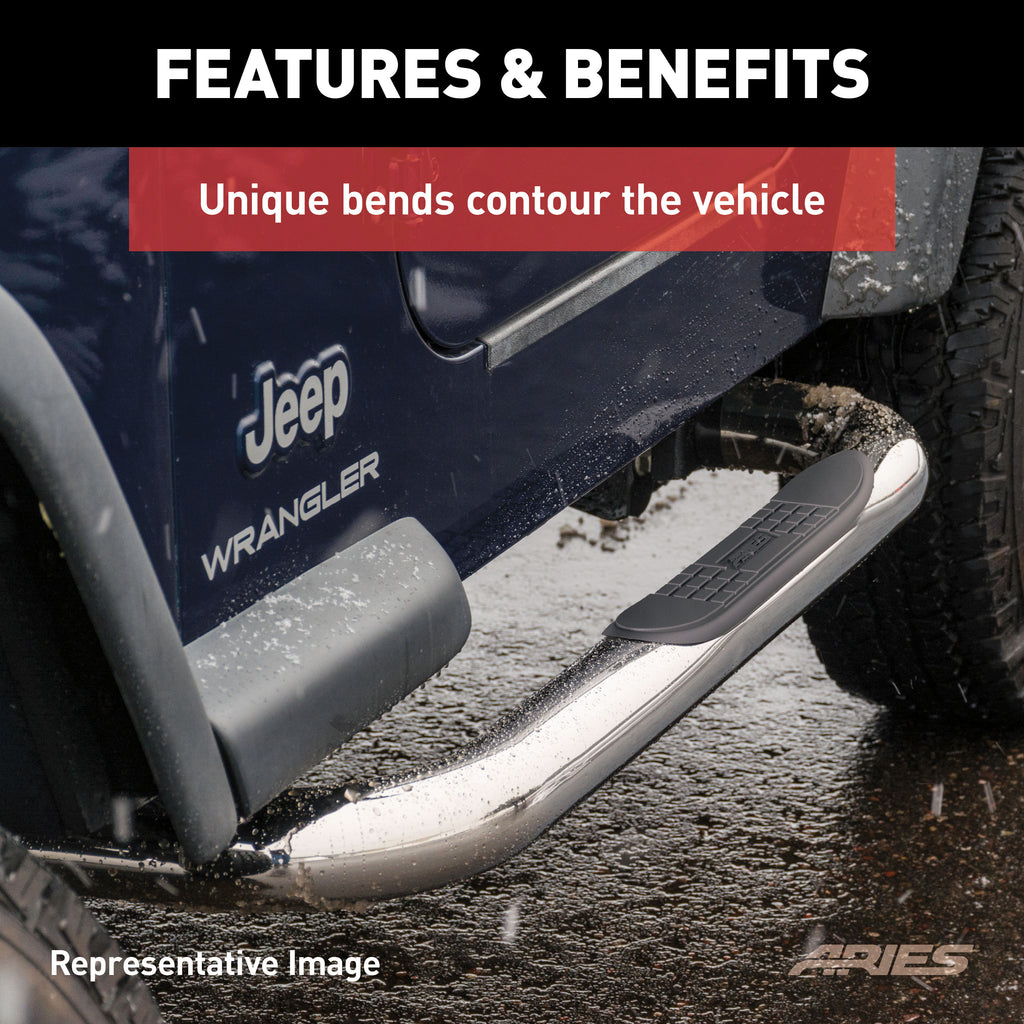 ARIES 3" side bars add a custom look and dependable footing to your truck, Jeep or SUV. They feature a classic style, a strong design and non-skid step pads. ARIES nerf bars are all made vehicle-specific for a custom, no-drill fit, and they are available in multiple finish options. This set of nerf bars is constructed from 304 stainless steel with a polished finish. Our 304 stainless steel is a true stainless with high nickel content, offering better corrosion resistance and a long-lasting finish. The polish is a triple application, resulting in a mirror-like shine to complement your vehicle. ARIES 3" round side bars also come with high-strength steel brackets and non-skid step pads. The mounting brackets -- as well as the side bars and step pads -- are custom-designed for specific makes and models to allow the nerf bars to contour to the lines of your vehicle. This ensures easy, no-drill installation and the strength necessary to provide solid footing. This particular set of custom nerf bars fits specific years of the Chevy Blazer K5 and GMC Blazer K5 (see application info to verify fitment). ARIES 3" round side bars also come with non-skid step pads made of polypropylene. These wide, custom-positioned step pads feature a textured pattern and cover a wide portion of the tubes to be more comfortable and high-traction, even in wet conditions.