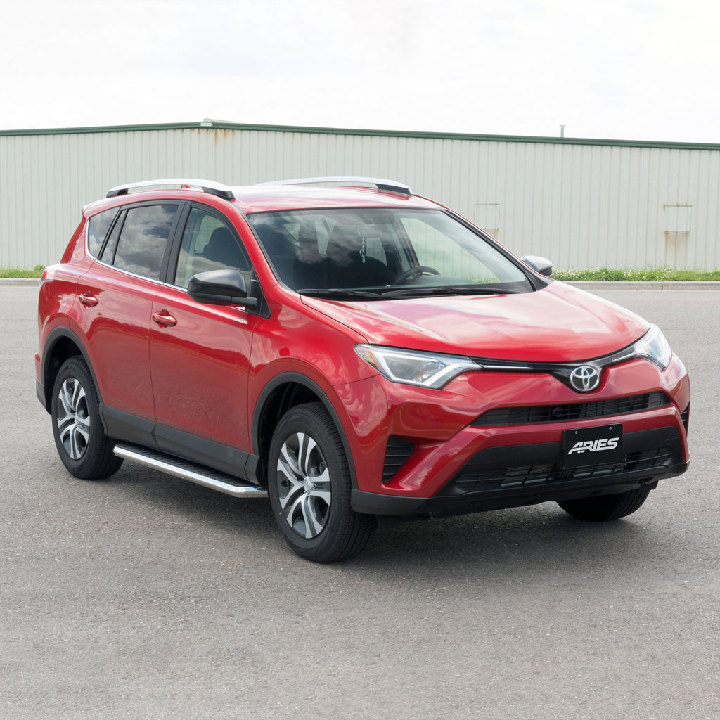 For some, it's more than just a drive. It's about definition -- finding the rush that comes with your hands on the wheel and your foot on the gas -- and it starts by stepping into your vehicle with confidence. ARIES AeroTread running boards give new definition to your drive with their sleek design, full-length treads and flawless finish. They feature unencumbered aluminum construction and a custom contour to redefine your look and offer a solid step up. Made specifically for today's crossover and SUV, ARIES AeroTread running boards are marked for their aerodynamic look and lightweight build. They are constructed from an extruded aluminum base, making them strong and impervious to the elements. Each set of running boards features sleek, curved edges with tapered ends to seamlessly blend with the body of your vehicle. To give you the exact, customized look you want, AeroTread running boards come with one of two front-trim finish options: polished stainless steel or black carbide powder-coated stainless steel. They are also equipped with a 5" wide, hard plastic step pad that runs the entire length of the board, providing a non-skid surface no matter where you place your foot. AeroTread running boards install using a track mounting system to attach vehicle-specific brackets, and pre-existing holes in the vehicle's frame are used to eliminate drilling, speed up installation and ensure stable footing. This set of running boards is designed to fit specific years of the Toyota RAV4 (see application information to verify compatibility with your vehicle). The mounting brackets are made from steel and are coated in a powder coat finish for long-lasting dependability. Whatever road you choose, define your drive with ARIES AeroTread running boards.
