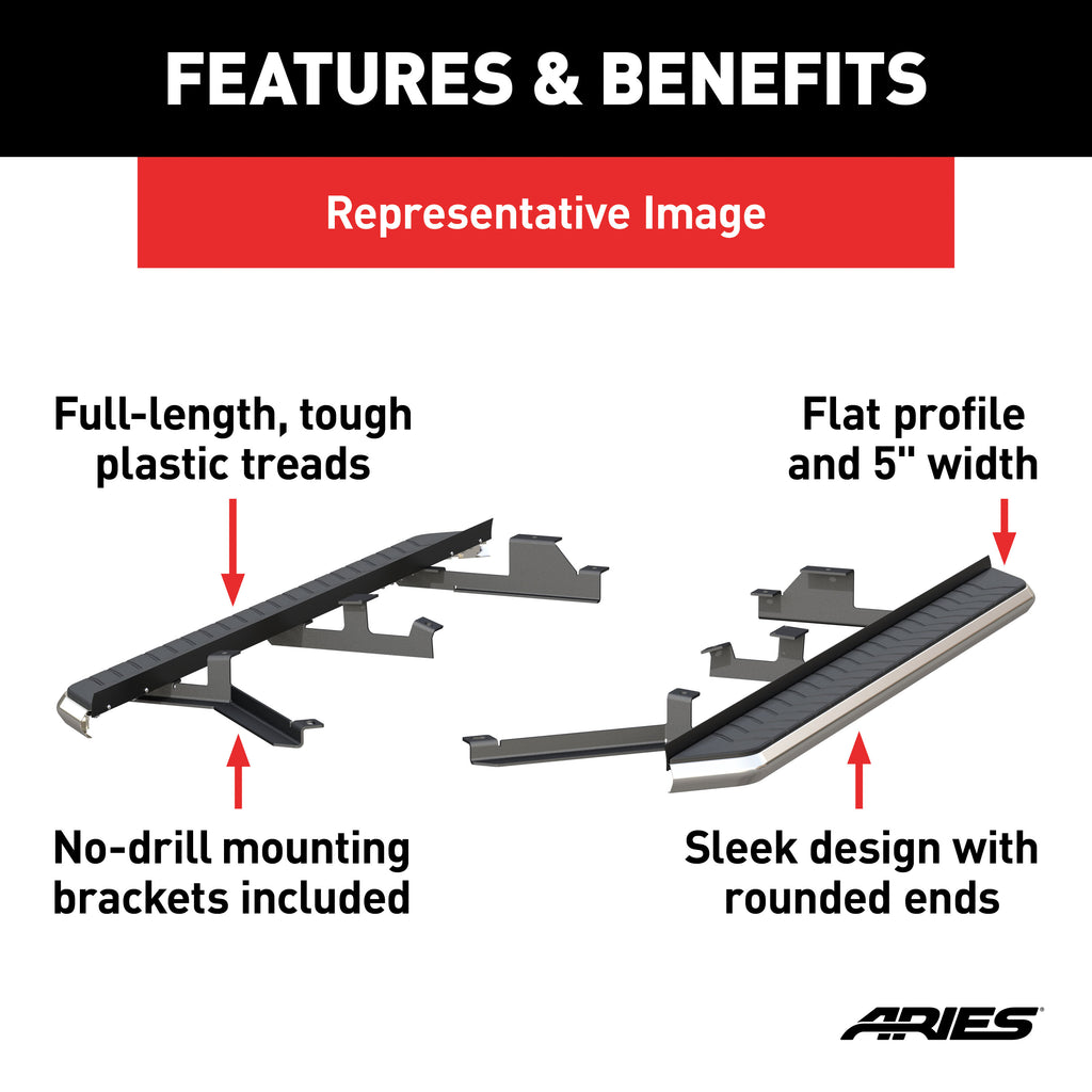 For some, it's more than just a drive. It's about definition -- finding the rush that comes with your hands on the wheel and your foot on the gas -- and it starts by stepping into your vehicle with confidence. ARIES AeroTread running boards give new definition to your drive with their sleek design, full-length treads and flawless finish. They feature unencumbered aluminum construction and a custom contour to redefine your look and offer a solid step up. Made specifically for today's crossover and SUV, ARIES AeroTread running boards are marked for their aerodynamic look and lightweight build. They are constructed from an extruded aluminum base, making them strong and impervious to the elements. Each set of running boards features sleek, curved edges with tapered ends to seamlessly blend with the body of your vehicle. To give you the exact, customized look you want, AeroTread running boards come with one of two front-trim finish options: polished stainless steel or black carbide powder-coated stainless steel. They are also equipped with a 5" wide, hard plastic step pad that runs the entire length of the board, providing a non-skid surface no matter where you place your foot. AeroTread running boards install using a track mounting system to attach vehicle-specific brackets, and pre-existing holes in the vehicle's frame are used to eliminate drilling, speed up installation and ensure stable footing. This set of running boards is designed to fit specific years of the Chevrolet Blazer (see application information to verify compatibility with your vehicle). The mounting brackets are made from steel and are coated in a powder coat finish for long-lasting dependability. Whatever road you choose, define your drive with ARIES AeroTread running boards.