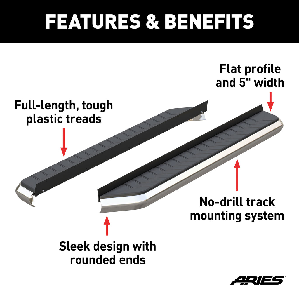 For some, it's more than just a drive. It's about definition -- finding the rush that comes with your hands on the wheel and your foot on the gas -- and it starts by stepping into your vehicle with confidence. ARIES AeroTread running boards give new definition to your drive with their sleek design, full-length treads and flawless finish. They feature unencumbered aluminum construction and a custom contour to redefine your look and offer a solid step up. Made specifically for today's crossover and SUV, ARIES AeroTread running boards are marked for their aerodynamic look and lightweight build. They are constructed from an extruded aluminum base, making them strong and impervious to the elements. Each set of running boards features sleek, curved edges with tapered ends to seamlessly blend with the body of your vehicle. To give you the exact, customized look you want, AeroTread running boards come with one of two front-trim finish options: polished stainless steel or black carbide powder-coated stainless steel. They are also equipped with a 5" wide, hard plastic step pad that runs the entire length of the board, providing a non-skid surface no matter where you place your foot. AeroTread running boards install using a track mounting system to attach vehicle-specific brackets, and pre-existing holes in the vehicle's frame are used to eliminate drilling, speed up installation and ensure stable footing (NOTE: Mounting brackets are sold separately, see the application information to determine which brackets and boards fit your vehicle). The mounting brackets are made from steel and are coated in a powder coat finish for long-lasting dependability. Whatever road you choose, define your drive with ARIES AeroTread running boards.