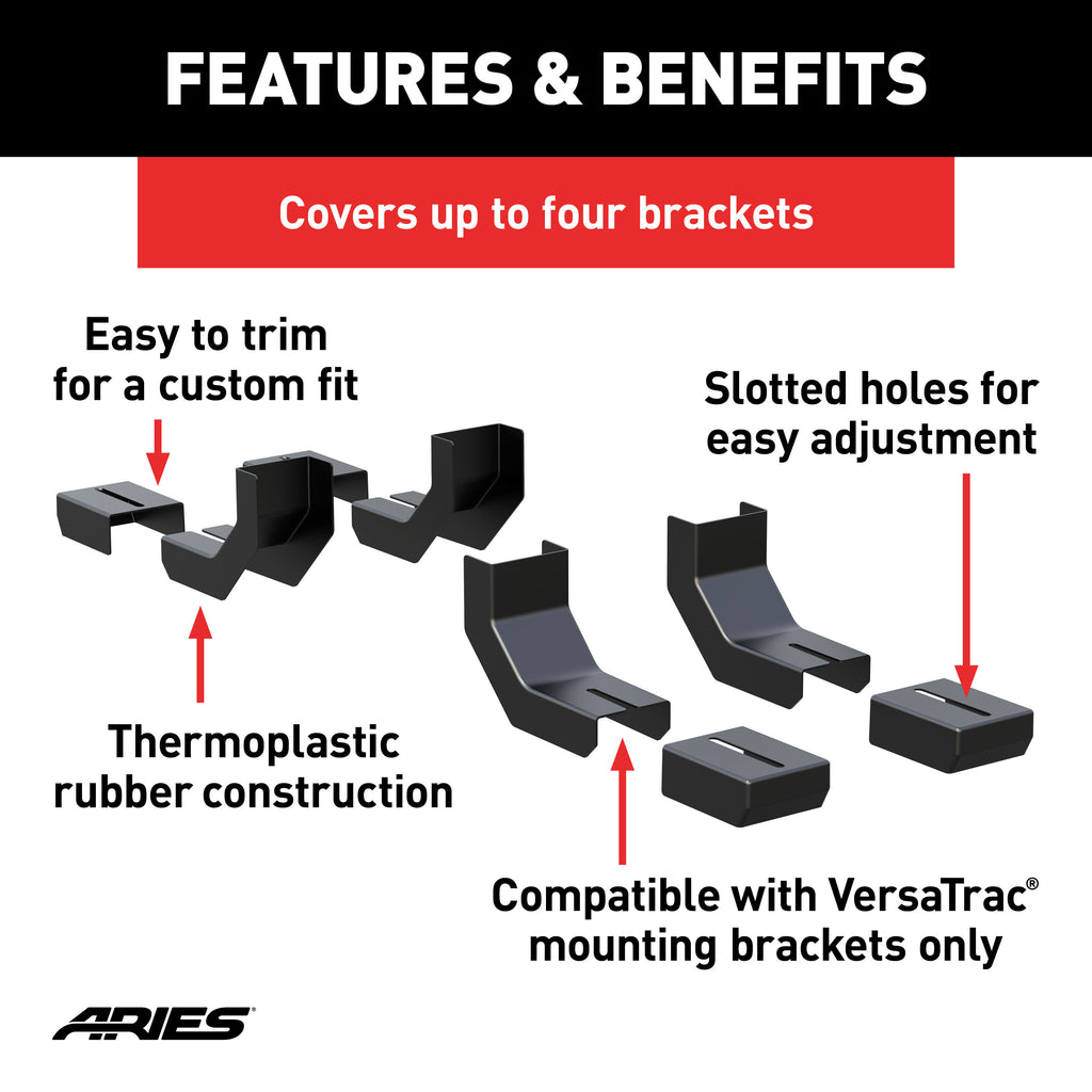 ARIES VersaTrac bracket covers add a finishing touch and extra protection to any ARIES running boards or side steps with the VersaTrac mounting system. The covers are designed to mount over the top of each bracket, giving the running board a more enhanced appearance. The covers are constructed from thermoplastic rubber to be strong and completely resilient to rust. The rubber helps protect the brackets from water, dirt and other elements, and it can easily be trimmed to accommodate any vehicle application. Installation of ARIES VersaTrac bracket covers is quick and easy. They feature slotted holes and utilize the existing mounting hardware on the running boards and running board brackets. The slotted holes allow for easy adjustments as needed. This package includes four bracket covers to accommodate regular cab applications and up to four mounting brackets. Packages of six and eight are also available for extended cab and crew cab.