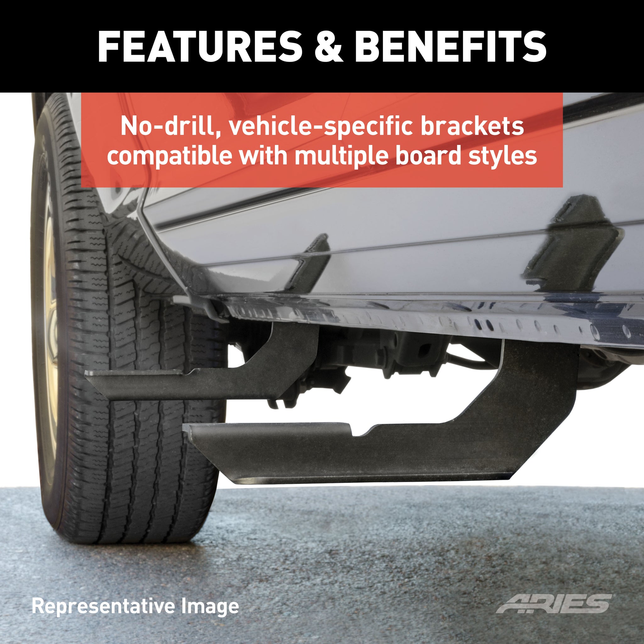 While many side accessories feature a universal track mounting system for easier installation and inventory requirements, the ARIES VersaTrac mounting system takes things a step further. VersaTrac uses a single set of vehicle-specific brackets to accommodate different side accessory options. This not only means different finish options but also different products entirely. With the brackets installed, any side bar or running board equipped with the VersaTrac mounting system can be attached or swapped out whenever desired. The VersaTrac mounting system saves you time and money. It eliminates the need to purchase and install an entirely new set of mounting brackets with each new side accessory. The mounting brackets are available for purchase as a stand-alone item or as part of a complete kit with compatible side bars and running boards. Use the application information to determine which part numbers will fit your vehicle.