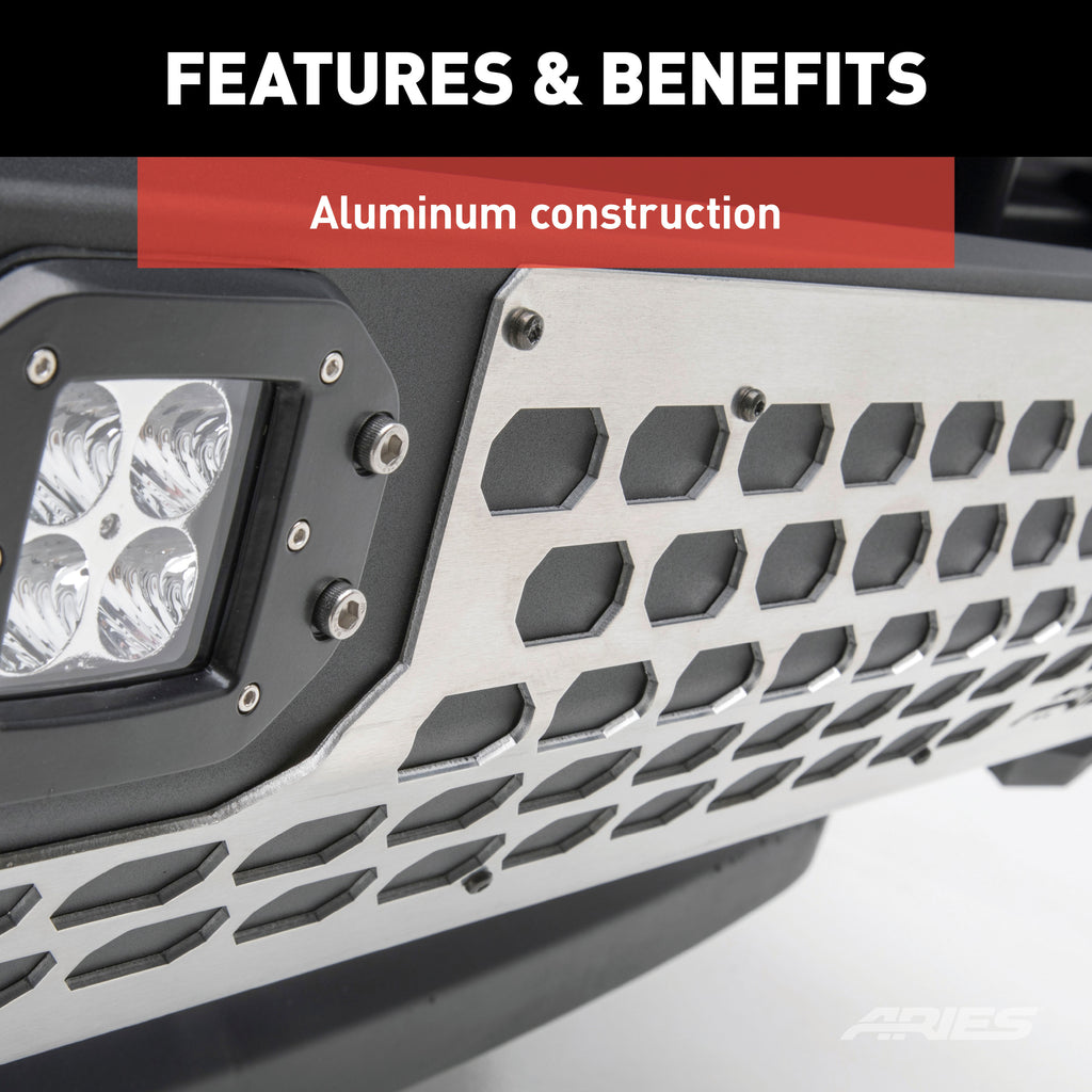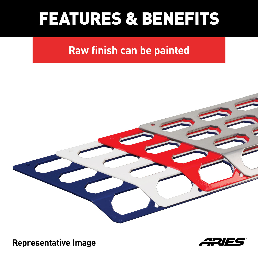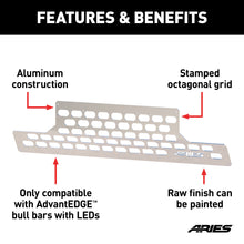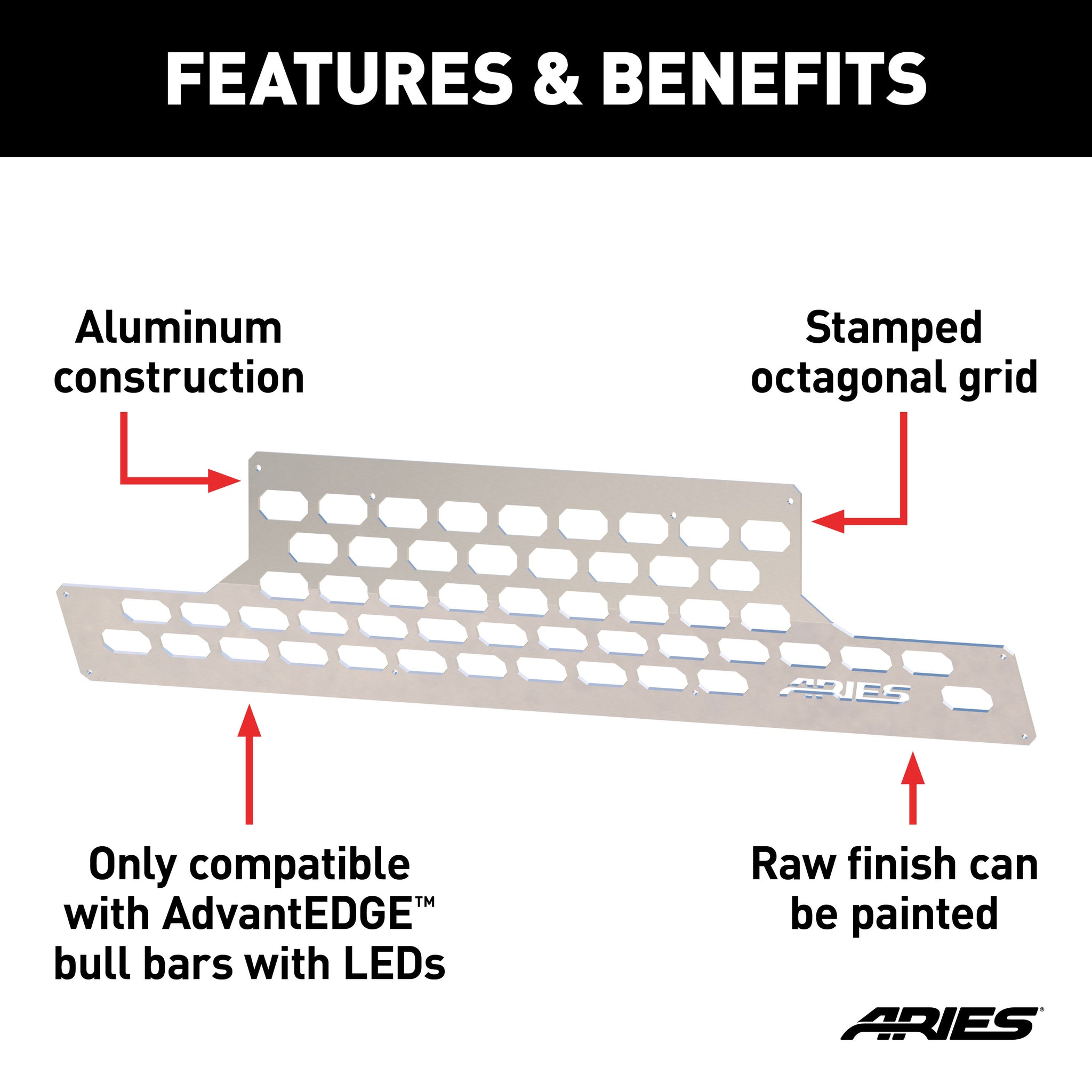 The AdvantEDGE bull bar boasts an all-aluminum construction and an aggressive look to complement the style of today's trucks. It is made with eight-sided, extruded aluminum tubing to be strong, lightweight and rust-free, and it features a tough powder coat finish in your choice of carbide black or chrome for maximum corrosion resistance. This raw aluminum cover plate is designed to replace the powder-coated AdvantEDGE bull bar cover plate and allow for ultimate customization. It can be painted any color to complement the look of your vehicle, and it comes with mounting hardware for easy installation. This cover plate is intended to fit AdvantEDGE bull bars with integrated, flush-mount LEDs.
