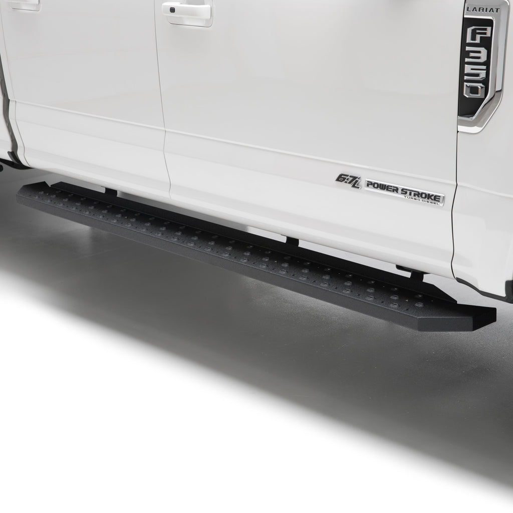 Powerful, definitive and uncompromising as a mountain ridge, ARIES RidgeStep running boards are made for those who gets it done, day after day. With their solid, all-steel construction, non-skid treads and tough powder coat finish, RidgeStep running boards are made to finish the job. Installation of these running boards is easy and secure because they use the ARIES VersaTrac mounting system. The underside of each board is equipped with a channel that accepts a set of heavy-duty bracket inserts. The inserts move along the channel to fit your truck, and the mounting hardware provides a secure attachment. These running boards are designed to fit specific years of the Ford F150, F250 Super Duty, F350 Super Duty, F450 Super Duty and F550 Super Duty crew cab (NOTE: This set of running boards includes vehicle-specific VersaTrac mounting brackets. See the application information to verify compatibility with your vehicle). ARIES RidgeStep running boards are not only made for easier installation, but they are also built to face the harsh elements of the commercial job. They feature high-strength, solid steel construction for a step that can keep up with those steel-toe boots, and they are completely without plastic parts, meaning they will not crack or fade over time. Their stamped, all-steel tread offers a 6-1/2" wide, non-skid surface that will never wear down no matter how many times you climb in and out of your truck. The end caps are also made from steel and are welded to contour to the body of your truck for a professional finish. RidgeStep running boards come with a unique E-coat and textured black powder coat finish to not only withstand rust but also to hide minor scratches and grime.