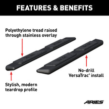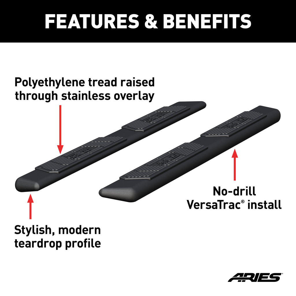 ARIES AscentSteps are truly modern running boards for today's trucks and SUVs. They feature an elegant teardrop profile, highly unique dual-constructed step pads, a rigid and rust-resistant build and a no-drill installation. AscentStep running boards are set apart from other, common oval side steps with their stylish, distinctive teardrop shape. The boards are rounded on the ends with seamlessly blended end caps, giving them subtle, superior style to complement your truck. The step pads of these running boards are also unique, featuring a two-part construction. They are comprised of a polyethylene tread base and a metal plate overlay. The poly treads protrude through the overlay, providing an aggressive accent and non-skid traction for a safe stepping surface. The stainless steel plates also help protect the running boards from scuffs, scratches and rust caused by frequent foot traffic. AscentStep running boards offer excellent rigidity with their high-strength steel construction. The steel is covered with a durable carbide black powder coat finish for dependable corrosion, scratch and UV resistance and for a clean, sleek look on your truck or SUV. Every set of ARIES AscentStep running boards is made for vehicle-specific application. This ensures optimal integration with the truck without any drilling or difficult modifications required. This particular set includes the running boards only (mounting brackets are sold separately). Additionally, AscentSteps are equipped with the VersaTrac system, meaning once the brackets are installed (brackets not included), they can accept other running boards or side steps with the VersaTrac system. This makes installation and customization easy.