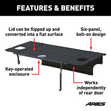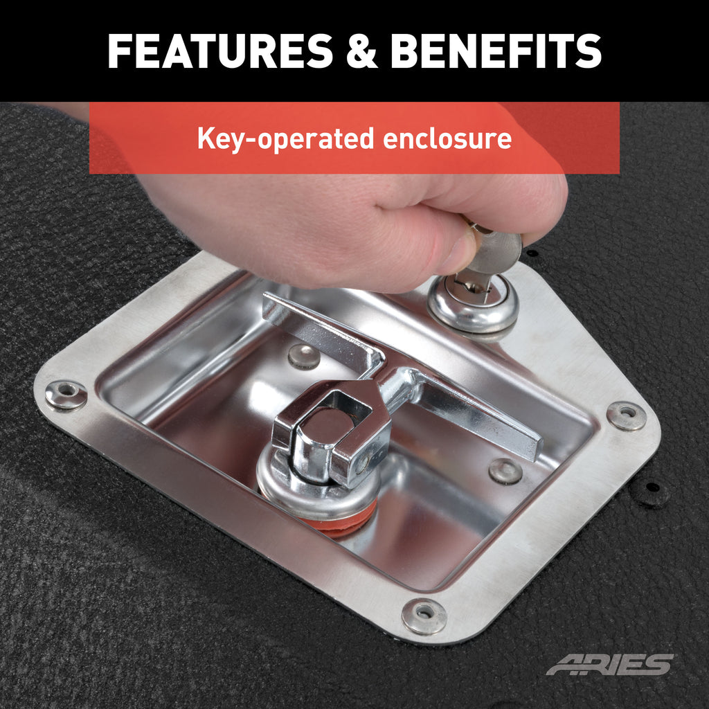 The ARIES Jeep security cargo lid is the perfect line of defense for your items, whether you're out on the trail or just putting in another day at the office. This six-panel, aluminum enclosure works with the layout of the Jeep JK 4-door to turn the rear compartment into a large, fully lockable storage area. The simple, six-panel design bolts directly into the bed of the Jeep Wrangler, utilizing the existing space and layout. This allows for a convenient storage area that works independently of the rear door and is compatible with the hardtop off or on, as well as with a soft top or subwoofer. It features a key-operated, quarter-turn latch for quick, convenient access to the cargo area. Simply insert the key, turn the latch and lift the lid. The locking latch mechanism is made with durable metal components and is covered in a chrome finish for lasting rust resistance. Tie-down anchors and a weight capacity of 75 lbs. allow additional items to be stored on top of the Jeep security cargo lid. The tie-down anchors have a 1/2" diameter to accept various cargo straps or bungees. The lid can also be flipped up and converted into a usable surface, such as a table or workbench. Part of building the ultimate off-roading machine is keeping your Jeep agile and lightweight. The ARIES security cargo lid is made with hardened, T6 aluminum construction, making it strong, rust-free and lightweight. An aluminum construction allows the lid to keep valuables safe, while easily withstanding the elements. Each panel is also covered in a textured black powder coat finish that is specifically designed to hide scratches and grime. For a complete installation, the ARIES Jeep security cargo lid comes with all necessary hardware.