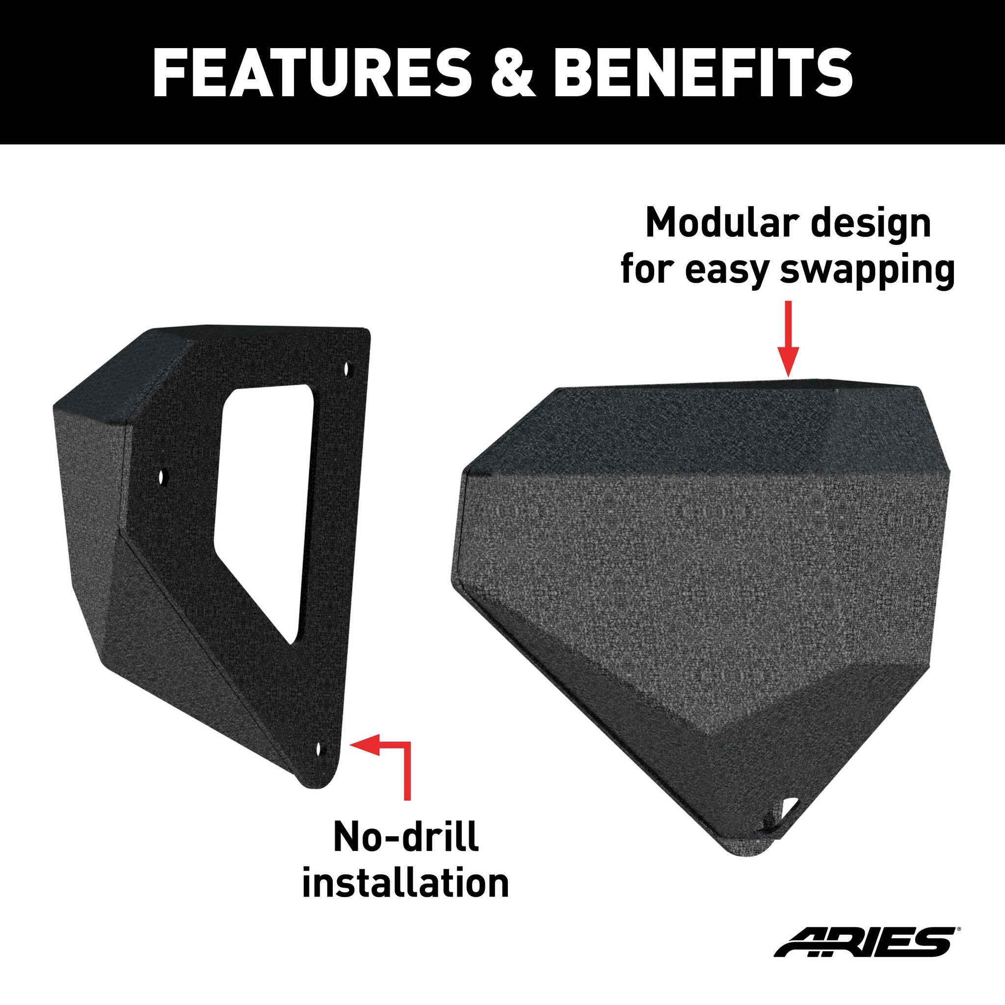 The ARIES TrailChaser Jeep bumper is unlike any other bumper for the Jeep Wrangler or Jeep Gladiator because it features a modular design. Each piece can be attached or swapped out as desired, giving you complete freedom of customization. This particular package includes the front-end corners only. These two corners are intended to be mounted on the TrailChaser front bumper center section (sold separately). They offer a professional finishing touch and can be drilled or cut to mount additional lights. They are also available with integrated, flush-mount LED lights. These corner end caps are constructed from T6 aluminum alloy to be strong, lightweight and rust-free, and have a unique, textured black powder coat finish for maximum corrosion resistance. They are also available in powder-coated steel.