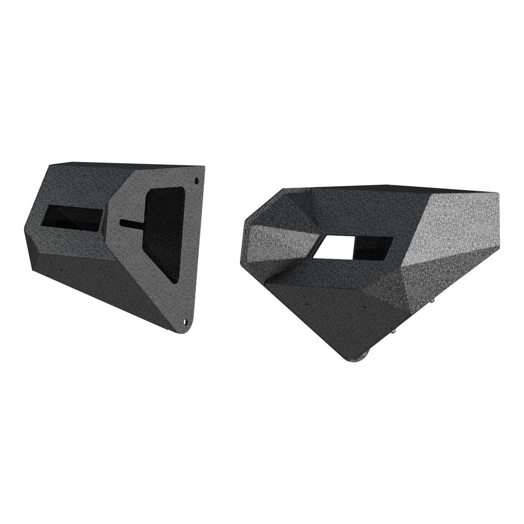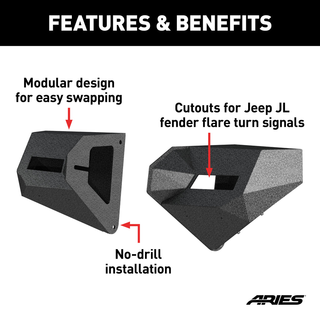 The ARIES TrailChaser Jeep bumper is unlike any other bumper for the Jeep Wrangler and Gladiator because it features a modular design. Each piece can be attached or swapped out as desired, giving you complete freedom of customization. This particular package includes the front-end corners only. These two corners are intended to be mounted on the TrailChaser front Jeep JL / JT bumper center section (sold separately). They provide cutouts to relocate the Jeep JL / JT fender flare turn signals when installing aftermarket fender flares. These corner end caps are constructed from high-strength carbon steel and have a unique, textured black powder coat finish for maximum rust resistance. They are also available in powder-coated aluminum.