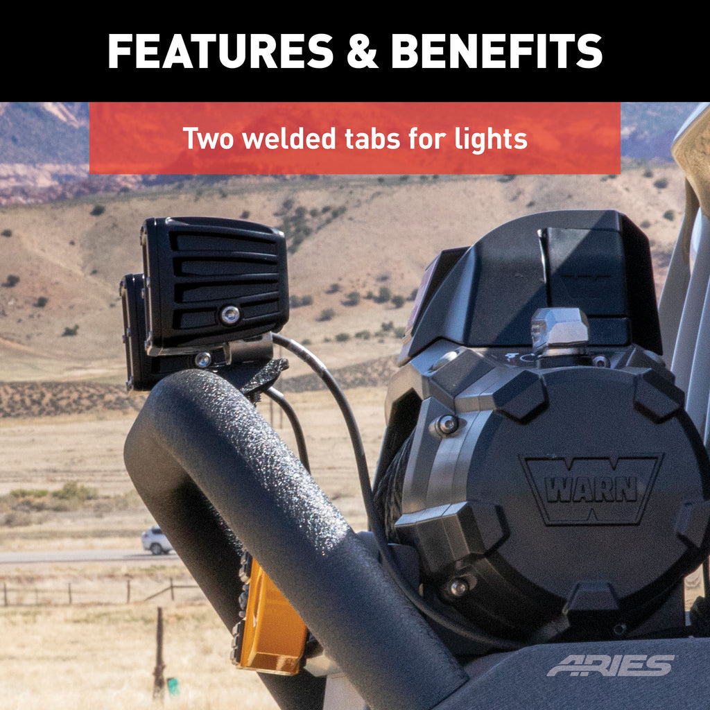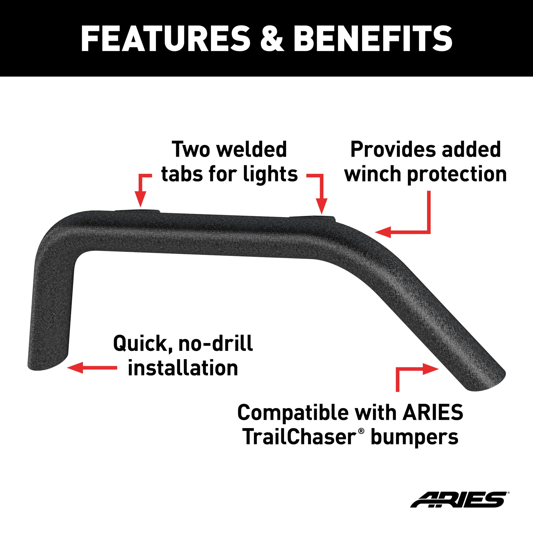 The ARIES TrailChaser Jeep bumper is unlike any other bumper for the Jeep Wrangler because it features a modular design. Each piece can be attached or swapped out as desired, giving you complete freedom of customization. This particular piece includes the front-end round center brush guard only and is intended to be mounted on the TrailChaser front bumper center section (sold separately). It features two welded tabs to mount an LED light bar or LED work lights and offers extra protection for the winch housing. This center brush guard is constructed from high-strength carbon steel and has a unique, textured black powder coat finish for maximum rust resistance. It is also available in powder-coated aluminum and in an angular design.