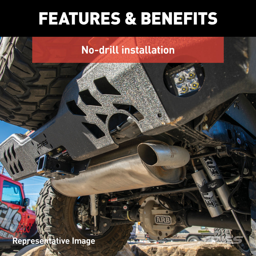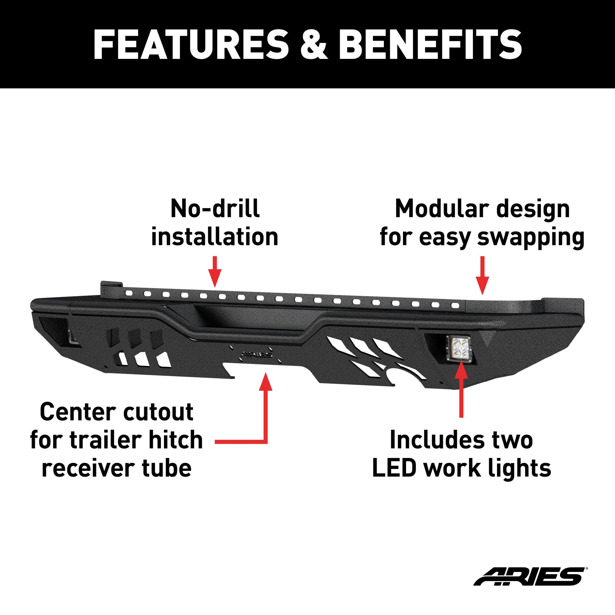The ARIES TrailChaser Jeep bumper is unlike any other bumper for the Jeep Wrangler JK because it features a modular design. This particular bumper for the rear of the Jeep includes the center section and side extensions with integrated LED lights. It is constructed from T6 aluminum alloy to be strong, lightweight and rust-free, and has a unique, textured black powder coat finish for maximum corrosion resistance. It is also available in high-strength, powder-coated steel. The bumper corners offer a professional finishing touch with their integrated LED lights. The 2" square work lights put out 2,200 lumens each and feature a flood beam pattern. They are made with grade-A LED chips, rust-free aluminum construction, an IP68-standard breather and dual heat sinks. They are also thoroughly tested and come with a waterproof wiring harness for easy installation. All ARIES TrailChaser bumpers install using pre-existing factory mounting points for fast, easy installation with no drilling required.