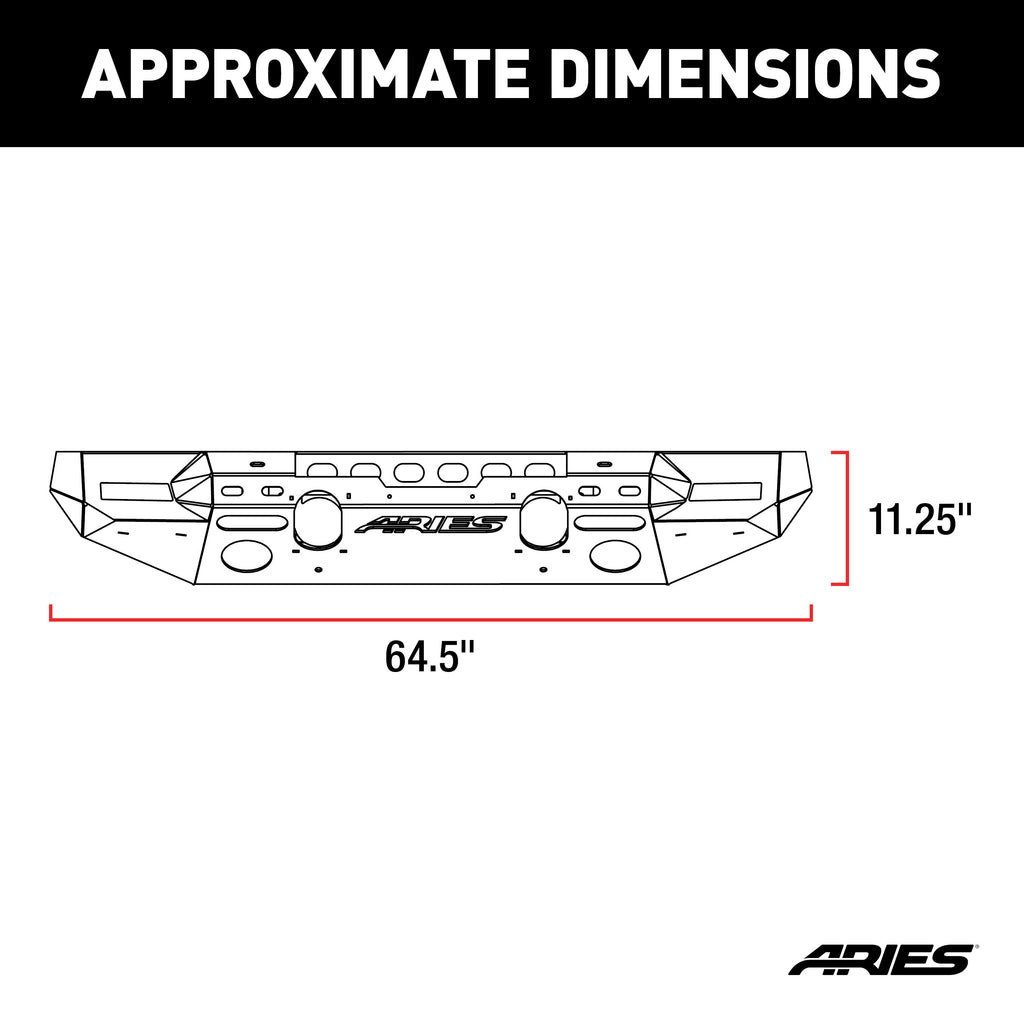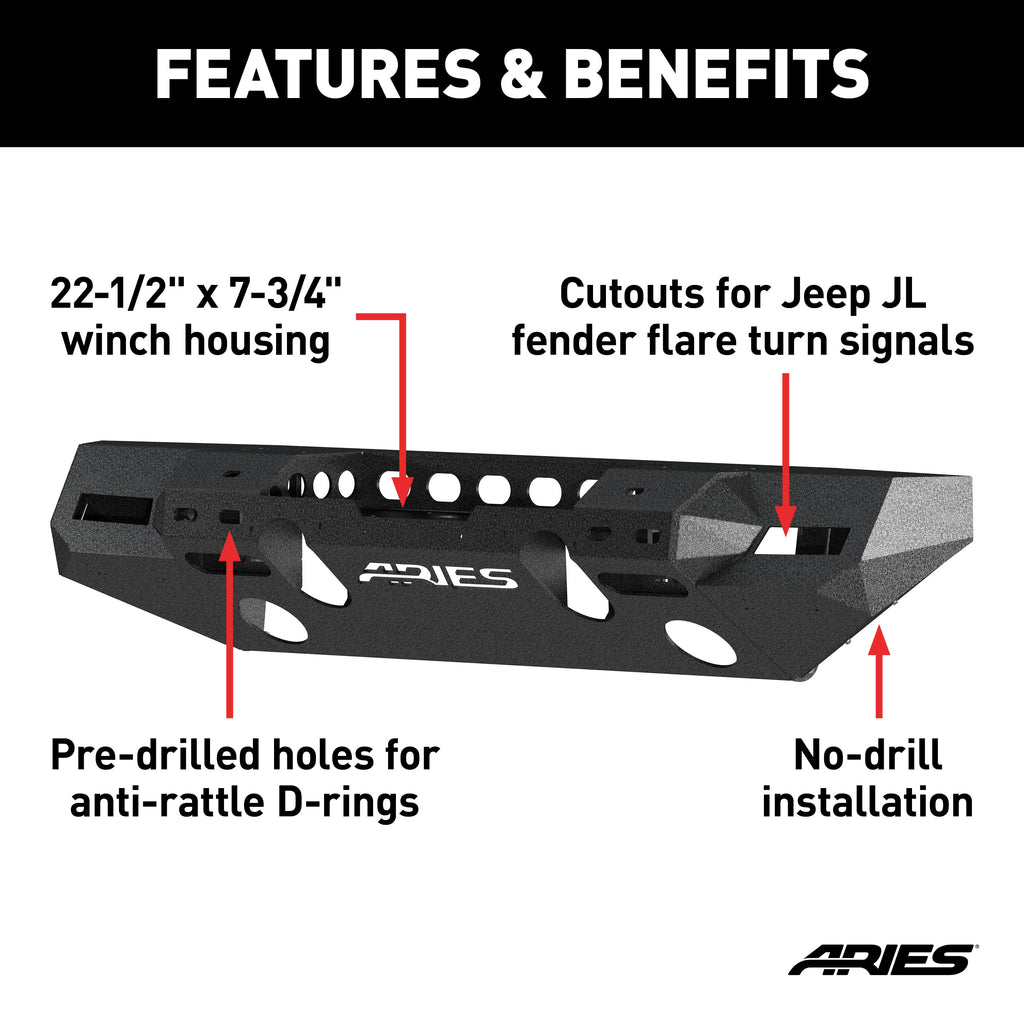 The ARIES TrailChaser Jeep bumper is unlike any other bumper for the Jeep Wrangler JL and Gladiator because it features a modular design. With a variety of options to choose from, you can select the perfect configuration to match the style of your Jeep. All TrailChaser bumpers are also compatible with a variety of accessories, including LED lights, D-rings, tow hooks and a winch. This particular TrailChaser bumper comes with a center section and corner end caps. The corners feature unique cutouts to integrate the Jeep JL / JT fender flare turn signals when installing aftermarket fender flares. The bumper is constructed from high-strength carbon steel and has a unique, textured black powder coat finish for maximum rust resistance. This same configuration is also available in lightweight, rust-free, powder-coated aluminum. The bumper center section features a standard 22-1/2" x 7-3/4" winch housing and is compatible with the ARIES winch adapter #2072100 for larger winches. It provides cutouts for lights and has pre-drilled holes for D-rings #2081300 and tow hooks #15600TW. All ARIES TrailChaser bumpers install using pre-existing factory mounting points for fast, easy installation with no drilling required.
