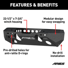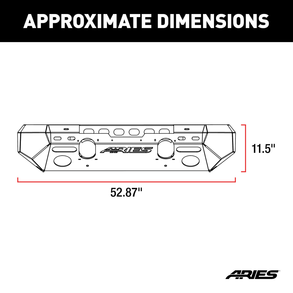 The ARIES TrailChaser Jeep bumper is unlike any other bumper for the Jeep Wrangler JL and Gladiator because it features a modular design. With a variety of options to choose from, you can select the perfect configuration to match the style of your Jeep. All TrailChaser bumpers are also compatible with a variety of accessories, including LED lights, D-rings, tow hooks and a winch. This particular TrailChaser bumper comes with a center section and corner end caps. It is constructed from T6 aluminum alloy to be strong, lightweight and rust-free, and has a unique, textured black powder coat finish for maximum corrosion resistance. It is also available in high-strength, powder-coated steel. The bumper center section features a standard 22-1/2" x 7-3/4" winch housing and is compatible with the ARIES winch adapter #2072100 for larger winches. It provides cutouts for lights and has pre-drilled holes for D-rings #2081300 and tow hooks #15600TW. The bumper corners offer a professional finishing touch with their compact, angular design. They feature the same durable powder coat as the center section and can be drilled or cut to mount additional lights. We also offer an option with these same corners with integrated, flush-mount LED lights. All ARIES TrailChaser bumpers install using pre-existing factory mounting points for fast, easy installation with no drilling required.