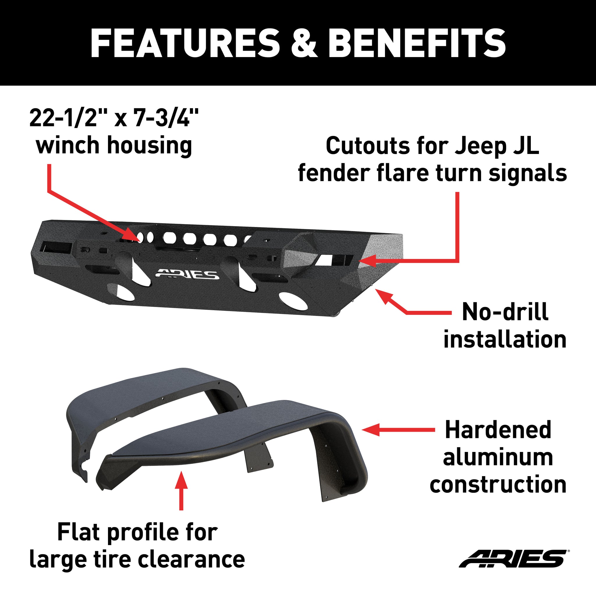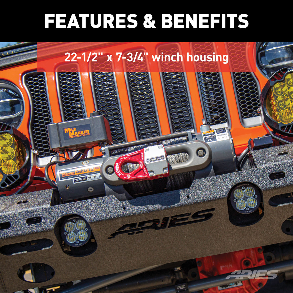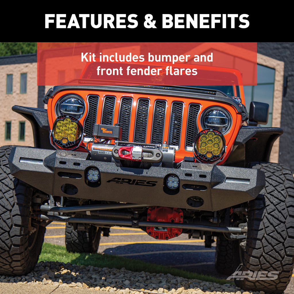The ARIES TrailChaser Jeep bumper is unlike any other bumper for the Jeep Wrangler JL because it features a modular design. With a variety of options to choose from, you can select the perfect configuration to match the style of your Jeep Wrangler. All TrailChaser bumpers are also compatible with a variety of accessories, including LED lights, D-rings, tow hooks and a winch. This particular TrailChaser bumper and fender flare kit comes with a bumper center section, corner end caps and front fender flares. The bumper corners feature unique cutouts to integrate the Jeep JL fender flare turn signals when installing the ARIES fender flares. ARIES Jeep fender flares add style and offroad readiness to your Jeep Wrangler JL, featuring rust-free aluminum construction, custom-fit contours and a narrower width to show off larger, offroad tires. Hardened, T6 aluminum alloy construction allows these fender flares to be strong, lightweight and rust-free. To maximum corrosion resistance, they are also covered in a unique textured black powder coat finish that helps hide minor scratches and grime accumulated on the trail. The TrailChaser bumper is also constructed from T6 aluminum alloy to be strong, lightweight and rust-free, and has a textured black powder coat finish for maximum corrosion resistance. It is also available in high-strength, powder-coated steel. The bumper center section features a standard 22-1/2" x 7-3/4" winch housing and is compatible with the ARIES winch adapter #2072100 for larger winches. It provides cutouts for lights and has pre-drilled holes for D-rings #2081300 and tow hooks #15600TW. All ARIES TrailChaser bumpers install using pre-existing factory mounting points for fast, easy installation with no drilling required.