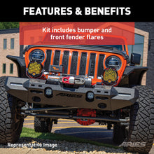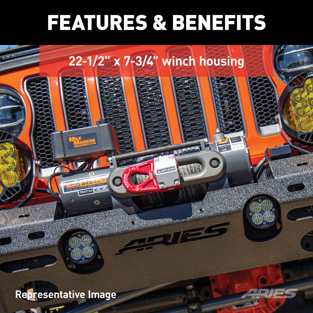 The ARIES TrailChaser Jeep bumper is unlike any other bumper for the Jeep Wrangler JL because it features a modular design. With a variety of options to choose from, you can select the perfect configuration to match the style of your Jeep Wrangler. All TrailChaser bumpers are also compatible with a variety of accessories, including LED lights, D-rings, tow hooks and a winch. This particular TrailChaser bumper and fender flare kit comes with a bumper center section, corner end caps, round center brush guard and front fender flares. The bumper corners feature unique cutouts to integrate the Jeep JL fender flare turn signals when installing the ARIES fender flares. ARIES Jeep fender flares add style and offroad readiness to your Jeep Wrangler JL, featuring rust-free aluminum construction, custom-fit contours and a narrower width to show off larger, offroad tires. Hardened, T6 aluminum alloy construction allows these fender flares to be strong, lightweight and rust-free. To maximum corrosion resistance, they are also covered in a unique textured black powder coat finish that helps hide minor scratches and grime accumulated on the trail. The TrailChaser bumper is constructed from high-strength carbon steel and has a textured black powder coat finish for maximum rust resistance. This same configuration is also available in lightweight, rust-free, powder-coated aluminum. The bumper center section features a standard 22-1/2" x 7-3/4" winch housing and is compatible with the ARIES winch adapter #2072100 for larger winches. It provides cutouts for lights and has pre-drilled holes for D-rings #2081300 and tow hooks #15600TW. The round tubular brush guard of this bumper not only adds extra style to your Jeep JL, but it also provides additional light mounting points. All ARIES TrailChaser bumpers install using pre-existing factory mounting points for fast, easy installation with no drilling required.