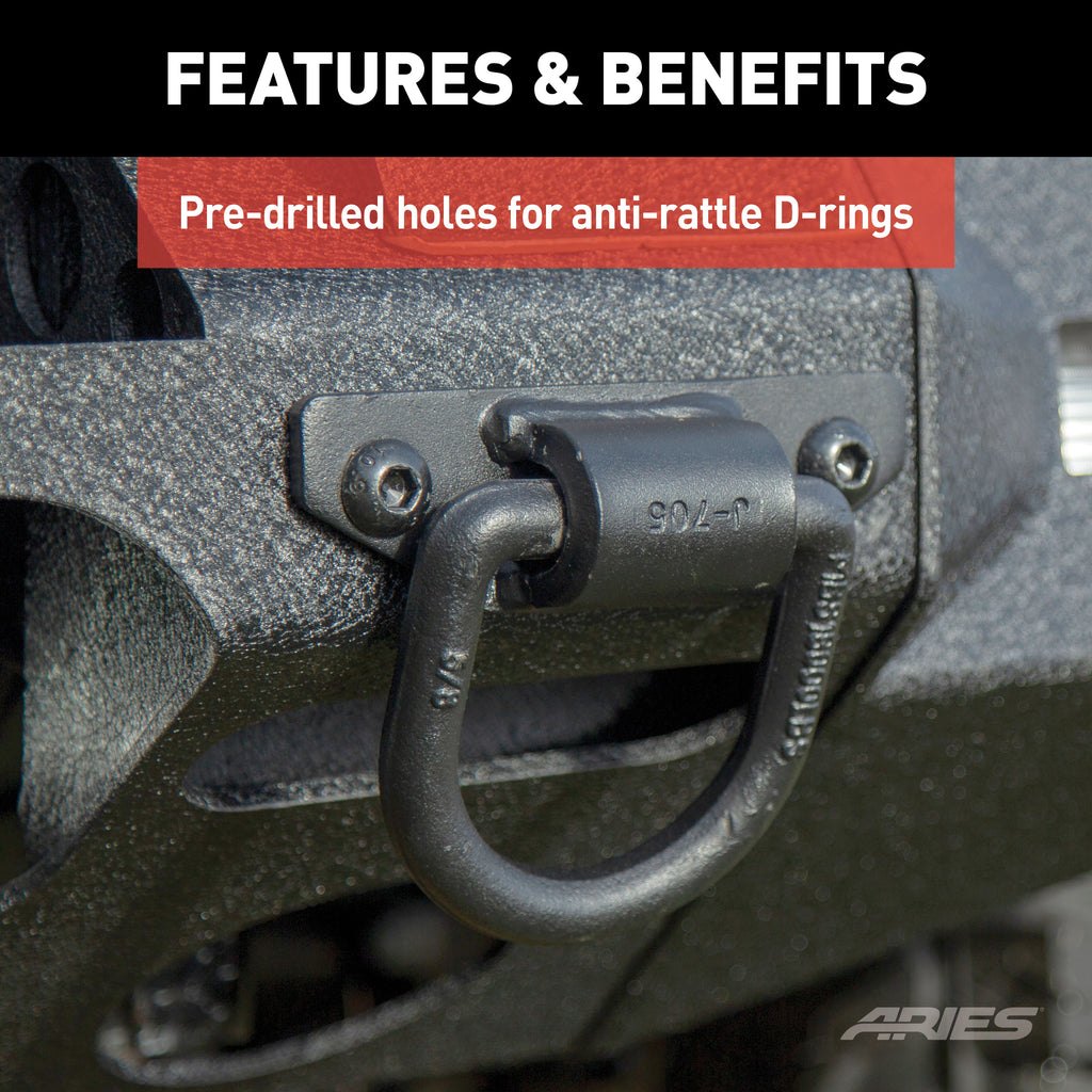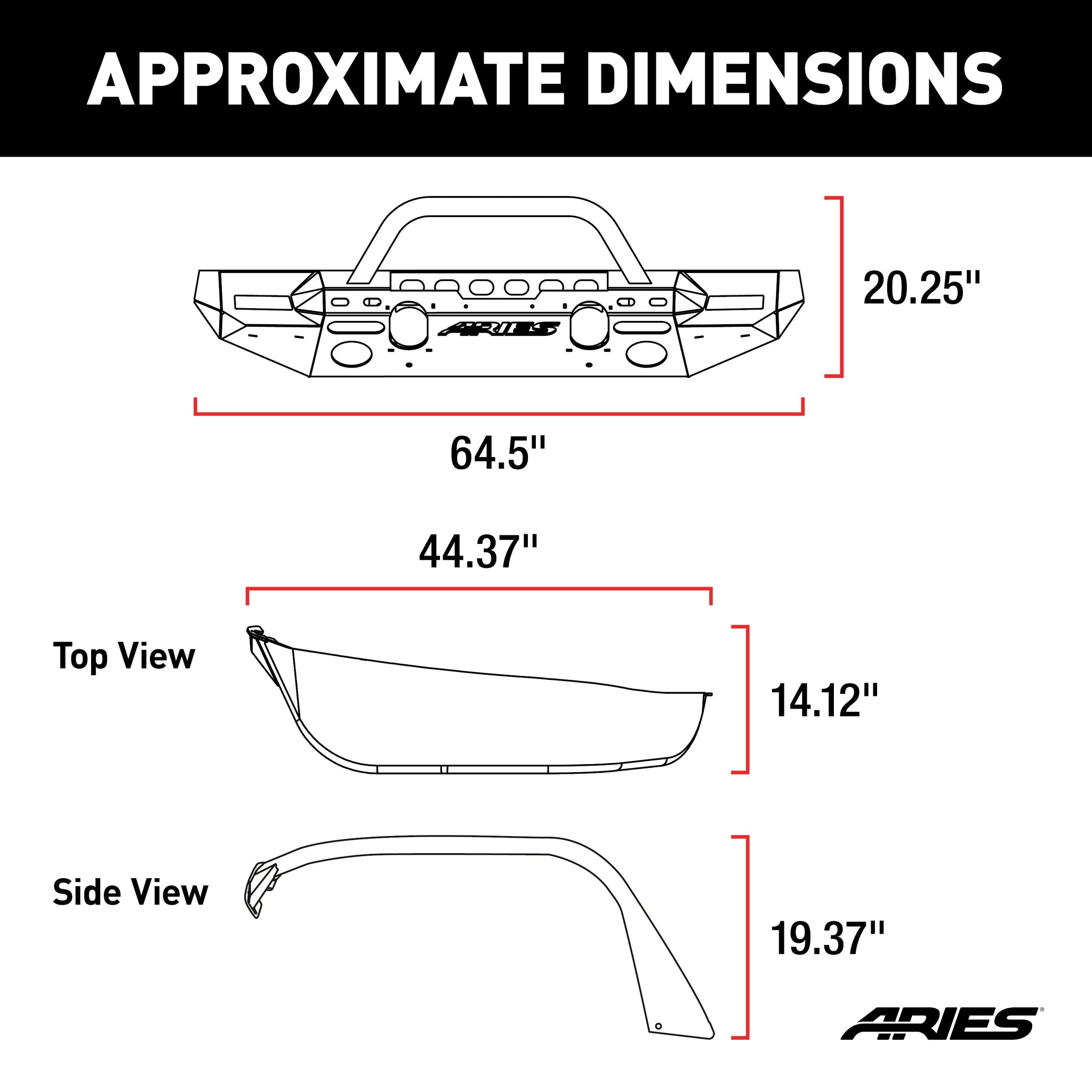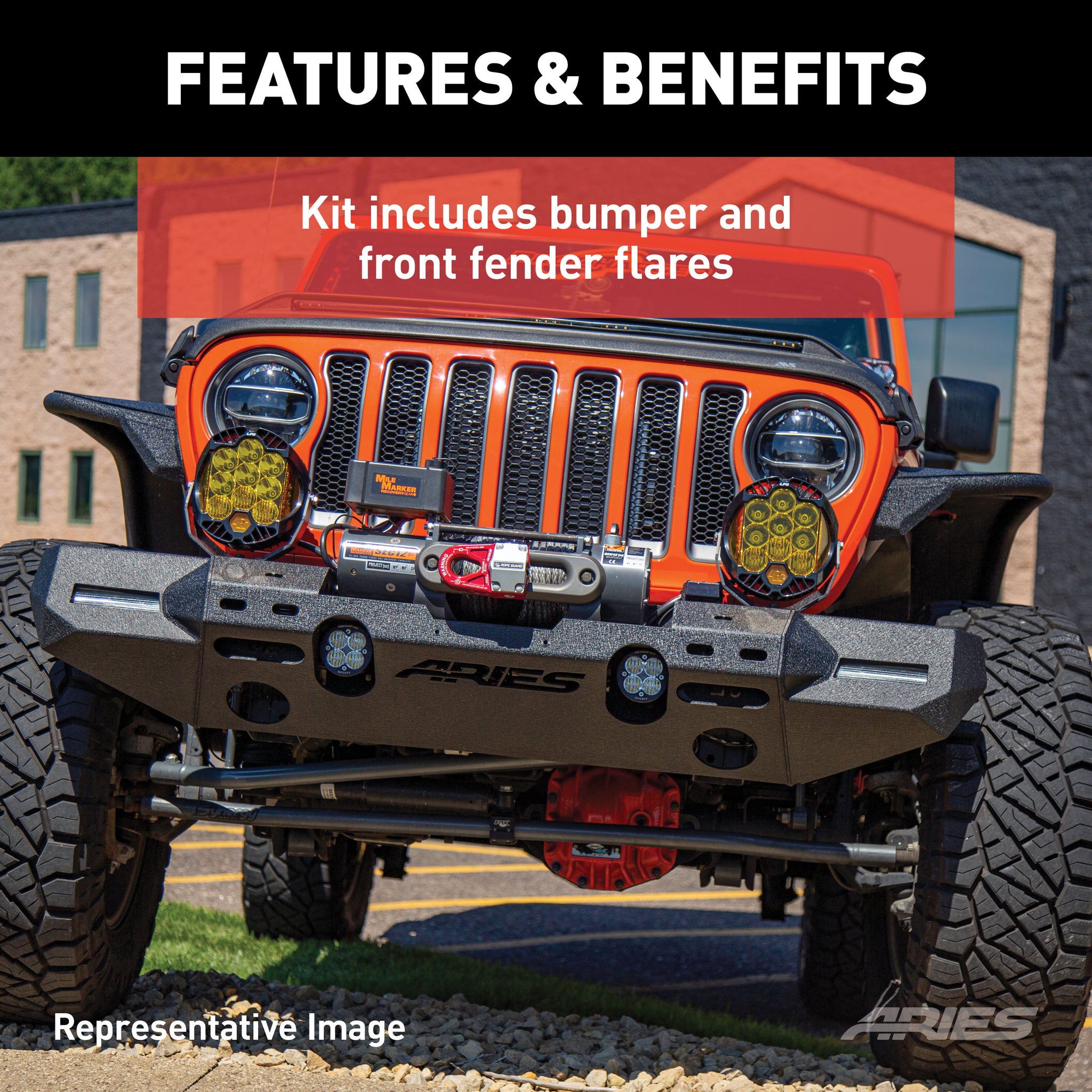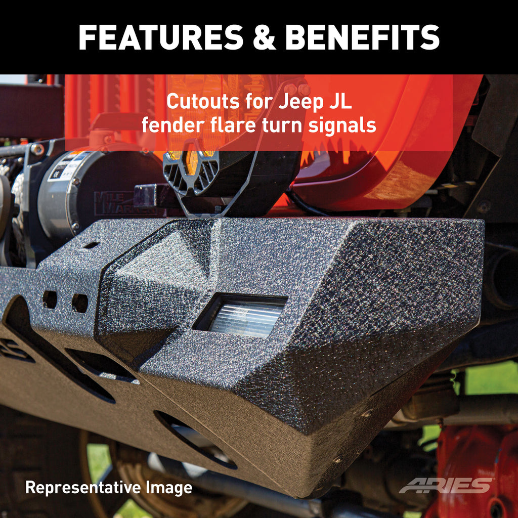 The ARIES TrailChaser Jeep bumper is unlike any other bumper for the Jeep Wrangler JL because it features a modular design. With a variety of options to choose from, you can select the perfect configuration to match the style of your Jeep Wrangler. All TrailChaser bumpers are also compatible with a variety of accessories, including LED lights, D-rings, tow hooks and a winch. This particular TrailChaser bumper and fender flare kit comes with a bumper center section, corner end caps, round center brush guard and front fender flares. The bumper corners feature unique cutouts to integrate the Jeep JL fender flare turn signals when installing the ARIES fender flares. ARIES Jeep fender flares add style and offroad readiness to your Jeep Wrangler JL, featuring rust-free aluminum construction, custom-fit contours and a narrower width to show off larger, offroad tires. Hardened, T6 aluminum alloy construction allows these fender flares to be strong, lightweight and rust-free. To maximum corrosion resistance, they are also covered in a unique textured black powder coat finish that helps hide minor scratches and grime accumulated on the trail. The TrailChaser bumper is also constructed from T6 aluminum alloy to be strong, lightweight and rust-free, and has a textured black powder coat finish for maximum corrosion resistance. It is also available in high-strength, powder-coated steel. The bumper center section features a standard 22-1/2" x 7-3/4" winch housing and is compatible with the ARIES winch adapter #2072100 for larger winches. It provides cutouts for lights and has pre-drilled holes for D-rings #2081300 and tow hooks #15600TW. The round tubular brush guard of this bumper not only adds extra style to your Jeep JL, but it also provides additional light mounting points. All ARIES TrailChaser bumpers install using pre-existing factory mounting points for fast, easy installation with no drilling required.