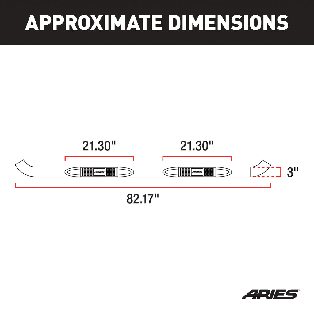 ARIES 3" side bars are more than a fancy decal for your truck, Jeep or SUV. They are a confident first step on each new adventure. These 3" nerf bars are constructed from strong carbon steel for superior rigidity, and they feature a sleek semi-gloss black powder coat finish. For an added edge, each nerf bar also goes through an E-coat process, before receiving its black powder coat, to strengthen and protect the final finish against peeling, chipping and scratching. ARIES 3" round side bars are also available in polished stainless steel or semi-gloss black powder-coated steel. All ARIES 3" nerf bars come with heavy-duty steel brackets and non-skid step pads. The mounting brackets are strong and custom-designed for specific makes and models to allow the side bars to contour to the lines of your vehicle. They offer easy installation and the strength necessary to provide sound footing. These particular custom nerf bars fit specific years of the Nissan Frontier and Suzuki Equator (see application info to verify fitment). ARIES 3" round side bars also come with non-skid step pads made of tough polypropylene. These step pads feature a textured pattern for enhanced safety, and they cover a wide portion of the tubes for a more comfortable step.