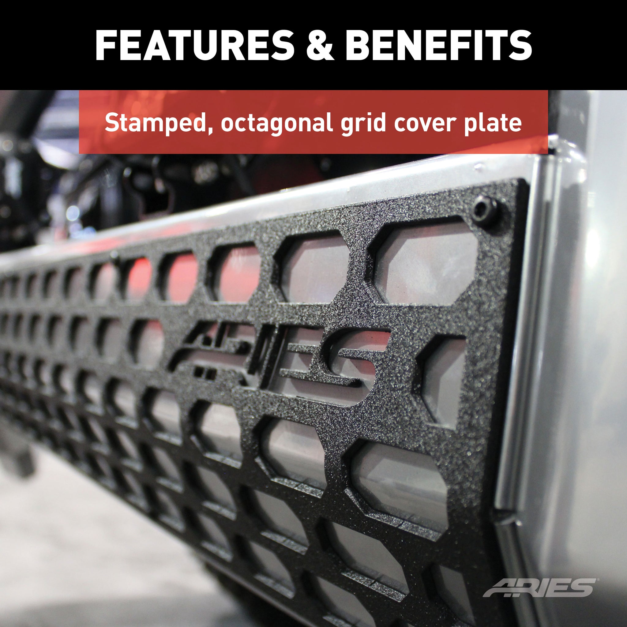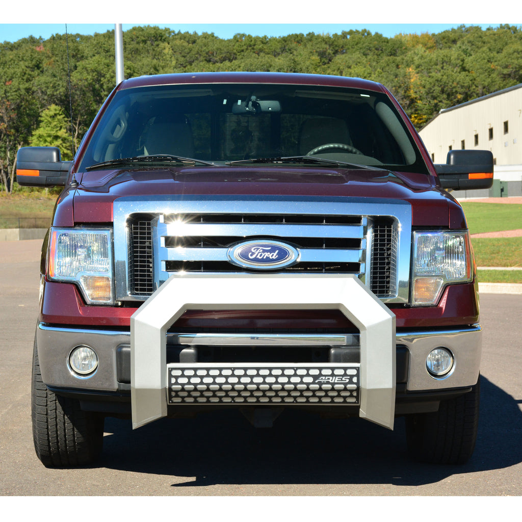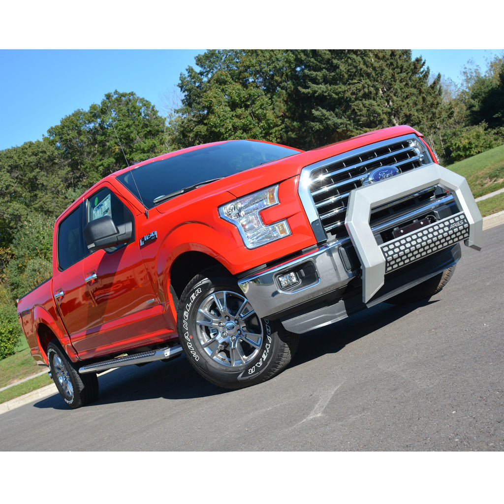The ARIES AdvantEDGE bull bar sets itself apart with a modern, angular design and all-aluminum construction. It features a track system for mounting auxiliary lights, vehicle-specific mounting brackets and is available in two finish options, allowing you to choose the look that perfectly matches your vehicle. Designed to complement the style of today's pickup trucks, the AdvantEDGE bull bar is as bold as it is tough. Instead of the common, rounded frame of most bull bars and grille guards, AdvantEDGE features a unique, 5-1/2" wide, eight-sided tube profile. Not only does the angled frame better accent the design of modern trucks, but it also offers a strong build. Like the AdvantEDGE headache rack and AdvantEDGE side bars, the AdvantEDGE bull bar is made entirely from aluminum, allowing it to be lightweight and rust-free. The tubular frame is also protected by a durable finish of carbide black powder coat or chrome powder coat. Each AdvantEDGE bull bar is fitted with a textured black aluminum cover plate on the crossbar, making it even more unique. The crossbar can be flipped to expose a track system for mounting LED light bars, work lights or other aftermarket lighting options. It is also available with integrated, flush-mount LED lights. Because each application is made for a custom fit, installation of the AdvantEDGE bull bar is simple and secure. It uses a track mounting system and vehicle-specific brackets to bolt onto pre-existing factory holes in the vehicle's frame. This speeds up installation and offers maximum rigidity. This particular AdvantEDGE bull bar is designed to fit specific years of the Ford F150 (see application info to verify fitment). The AdvantEDGE bull bar is made to complement our AdvantEDGE side bars and AdvantEDGE headache rack, giving you a complete look for your truck and a style unlike any other.