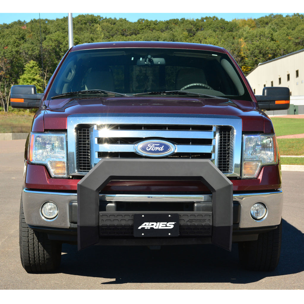 The ARIES AdvantEDGE bull bar sets itself apart with a modern, angular design and all-aluminum construction. It features a track system for mounting auxiliary lights, vehicle-specific mounting brackets and is available in two finish options, allowing you to choose the look that perfectly matches your vehicle. Designed to complement the style of today's pickup trucks, the AdvantEDGE bull bar is as bold as it is tough. Instead of the common, rounded frame of most bull bars and grille guards, AdvantEDGE features a unique, 5-1/2" wide, eight-sided tube profile. Not only does the angled frame better accent the design of modern trucks, but it also offers a strong build. Like the AdvantEDGE headache rack and AdvantEDGE side bars, the AdvantEDGE bull bar is made entirely from aluminum, allowing it to be lightweight and rust-free. The tubular frame is also protected by a durable finish of carbide black powder coat or chrome powder coat. Each AdvantEDGE bull bar is fitted with a textured black aluminum cover plate on the crossbar, making it even more unique. The crossbar can be flipped to expose a track system for mounting LED light bars, work lights or other aftermarket lighting options. It is also available with integrated, flush-mount LED lights. Because each application is made for a custom fit, installation of the AdvantEDGE bull bar is simple and secure. It uses a track mounting system and vehicle-specific brackets to bolt onto pre-existing factory holes in the vehicle's frame. This speeds up installation and offers maximum rigidity. This particular AdvantEDGE bull bar is designed to fit specific years of the Ford F250 Super Duty, F350 Super Duty, F450 Super Duty and F550 Super Duty (see application info to verify fitment). The AdvantEDGE bull bar is made to complement our AdvantEDGE side bars and AdvantEDGE headache rack, giving you a complete look for your truck and a style unlike any other.