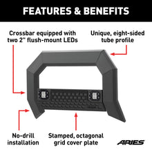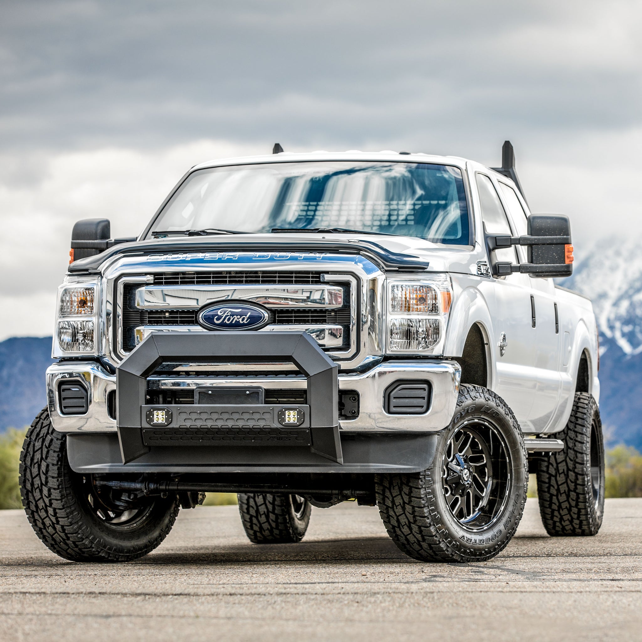 The ARIES AdvantEDGE bull bar is a unique, modern truck bull bar option, featuring a patented design, a highly corrosion-resistant construction and an easy, no-drill installation. For ultimate customization, it also comes with integrated LED lights and two finish options. The AdvantEDGE bull bar with lights is unlike all other bull bars for trucks. It's octagonal tubing and angular, A-frame shape give it an aggressive aftermarket look and complement the look of the modern pickup truck. To maintain a long-lasting, consistent finish, the AdvantEDGE bull bar is constructed from extruded aluminum alloy, making it strong, lightweight and rust-free. It is also protected in a durable powder coat finish for additional corrosion resistance, and it is available in two color choices: chrome powder coat or carbide black powder coat. To add utility and an unmistakable accent to your truck, this bull bar also features flush-mount LED lights. These 2" square lights are constructed with grade-A LED chips and IP68 and IP69K waterproof and dustproof ratings. They feature flood beams and provide 2,200 lumens. The AdvantEDGE bull bar is also available without lights. For fast and easy installation, the AdvantEDGE bull bar with lights is made vehicle-specific. This allows the bull bar to mount securely with no drilling required. This particular bull bar fits specific years of the Ford F-250 Super Duty, F-350 Super Duty, F-450 Super Duty and F-550 Super Duty (see application info to verify fitment). It comes with high-strength powder-coated steel brackets and a waterproof wiring harness for a complete installation. The AdvantEDGE bull bar is designed to complement the rest of the AdvantEDGE series, including the AdvantEDGE headache rack and AdvantEDGE side bars.