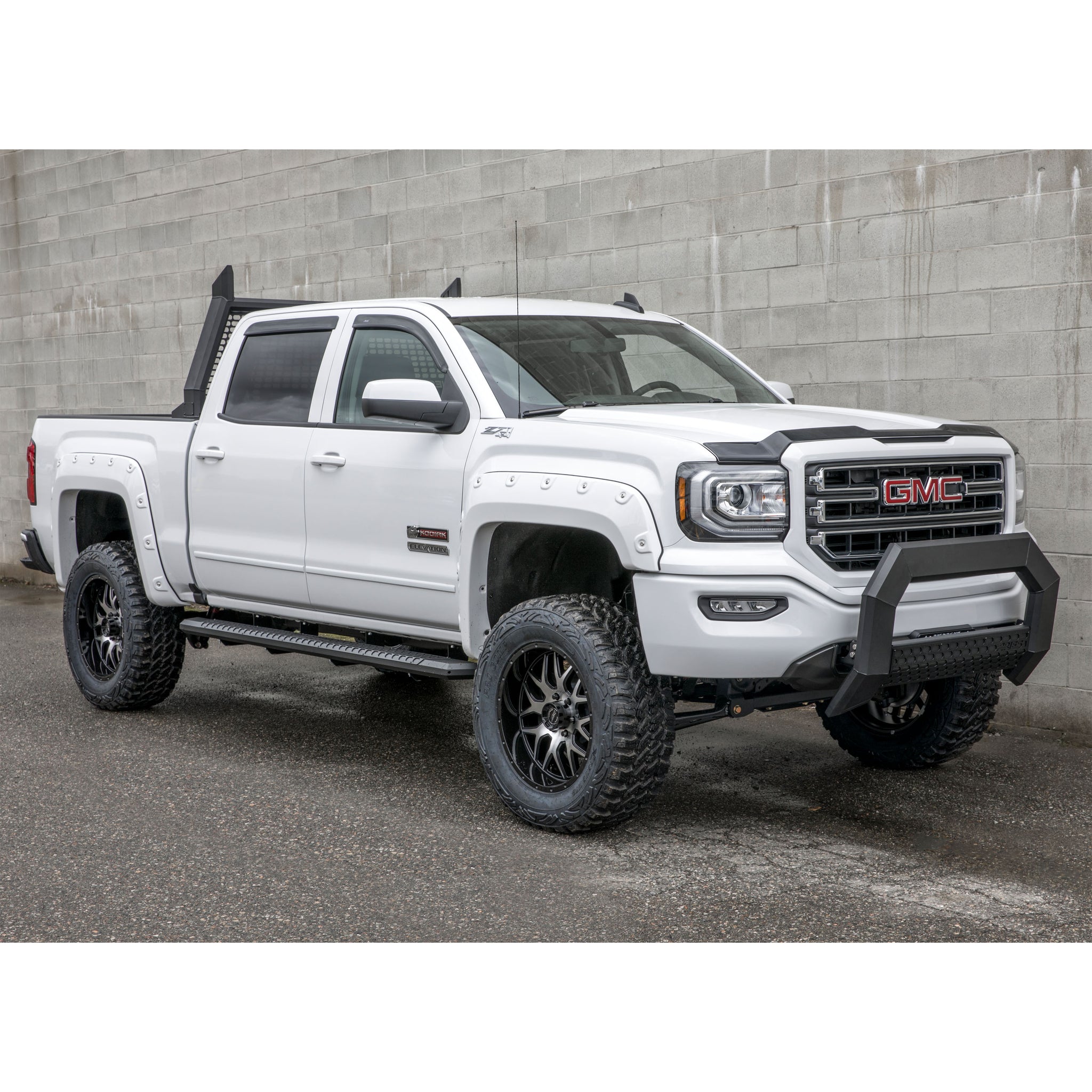 The ARIES AdvantEDGE bull bar sets itself apart with a modern, angular design and all-aluminum construction. It features a track system for mounting auxiliary lights, vehicle-specific mounting brackets and is available in two finish options, allowing you to choose the look that perfectly matches your vehicle. Designed to complement the style of today's pickup trucks, the AdvantEDGE bull bar is as bold as it is tough. Instead of the common, rounded frame of most bull bars and grille guards, AdvantEDGE features a unique, 5-1/2" wide, eight-sided tube profile. Not only does the angled frame better accent the design of modern trucks, but it also offers a strong build. Like the AdvantEDGE headache rack and AdvantEDGE side bars, the AdvantEDGE bull bar is made entirely from aluminum, allowing it to be lightweight and rust-free. The tubular frame is also protected by a durable finish of carbide black powder coat or chrome powder coat. Each AdvantEDGE bull bar is fitted with a textured black aluminum cover plate on the crossbar, making it even more unique. The crossbar can be flipped to expose a track system for mounting LED light bars, work lights or other aftermarket lighting options. It is also available with integrated, flush-mount LED lights. Because each application is made for a custom fit, installation of the AdvantEDGE bull bar is simple and secure. It uses a track mounting system and vehicle-specific brackets to bolt onto pre-existing factory holes in the vehicle's frame. This speeds up installation and offers maximum rigidity. This particular AdvantEDGE bull bar is designed to fit specific years of the Chevy Silverado 1500 and GMC Sierra 1500, 1500 Classic or 1500 HD Classic (see application info to verify fitment). The AdvantEDGE bull bar is made to complement our AdvantEDGE side bars and AdvantEDGE headache rack, giving you a complete look for your truck and a style unlike any other.