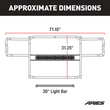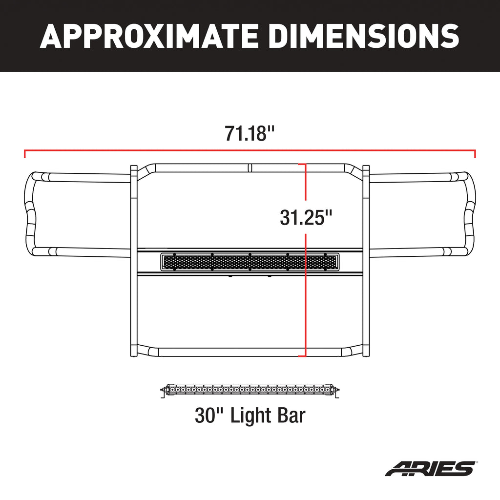 The ARIES Pro Series grille guard is unlike any other grille guard or brush guard on the road today because of its patented center crossbar. The ARIES Pro Series grille guard has a unique center crossbar that houses an LED light bar, allowing you to truly set your truck apart from all others. Rather than using a set of light clips or forcing you to drill holes into the frame, the aerodynamic crossbar of the Pro Series grille guard is the light bar housing itself. It uses a 30" slotted channel bracket to mount the included 30" LED light bar #1501264. The bracket can also accept other single-row light bars (some 30" light bars may not fit). The crossbar mount can also articulate, allowing you to position the light beam at any angle you prefer. Integrating the channel mount into the crossbar housing also keeps the light bar protected from the elements. To further stylize your truck, the Pro Series grille guard also comes with an interchangeable grille guard cover plate. Included with each grille guard is a black mesh cover plate that easily bolts on and provides added security for your aftermarket lights. The mesh cover plate can be swapped out with other cover plate options, including five different styles and two finishes. Solid construction should be an essential feature of any grille guard, and the Pro Series grille guard is more than qualified. It has a one-piece design of 1/4" thick welded plates and 1-1/2" mandrel-bent carbon steel tubing. We also finish each Pro Series grille guard in a highly durable, dual-layer E-coat and textured black powder coat, giving it resilience to rust and scratches. This unique finish also helps hide minor scratches and grime to maintain a clean look. ARIES Pro Series grille guards are made vehicle-specific for seamless integration with the factory bumper and an easy, no-drill installation. This grille guard fits select model years of the Toyota Tacoma (see application info to verify fitment).