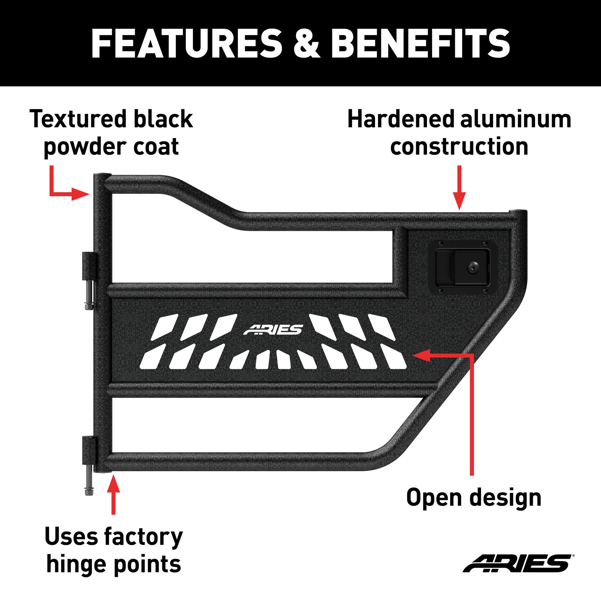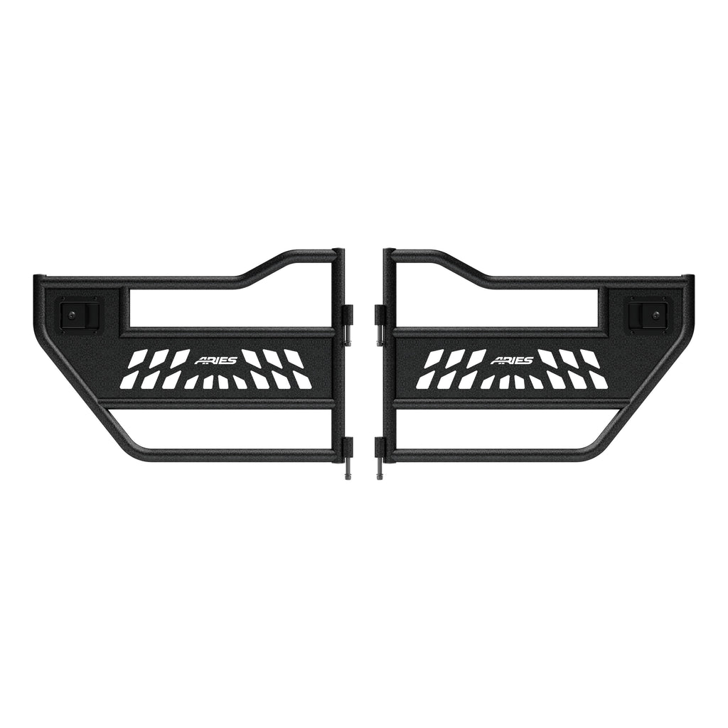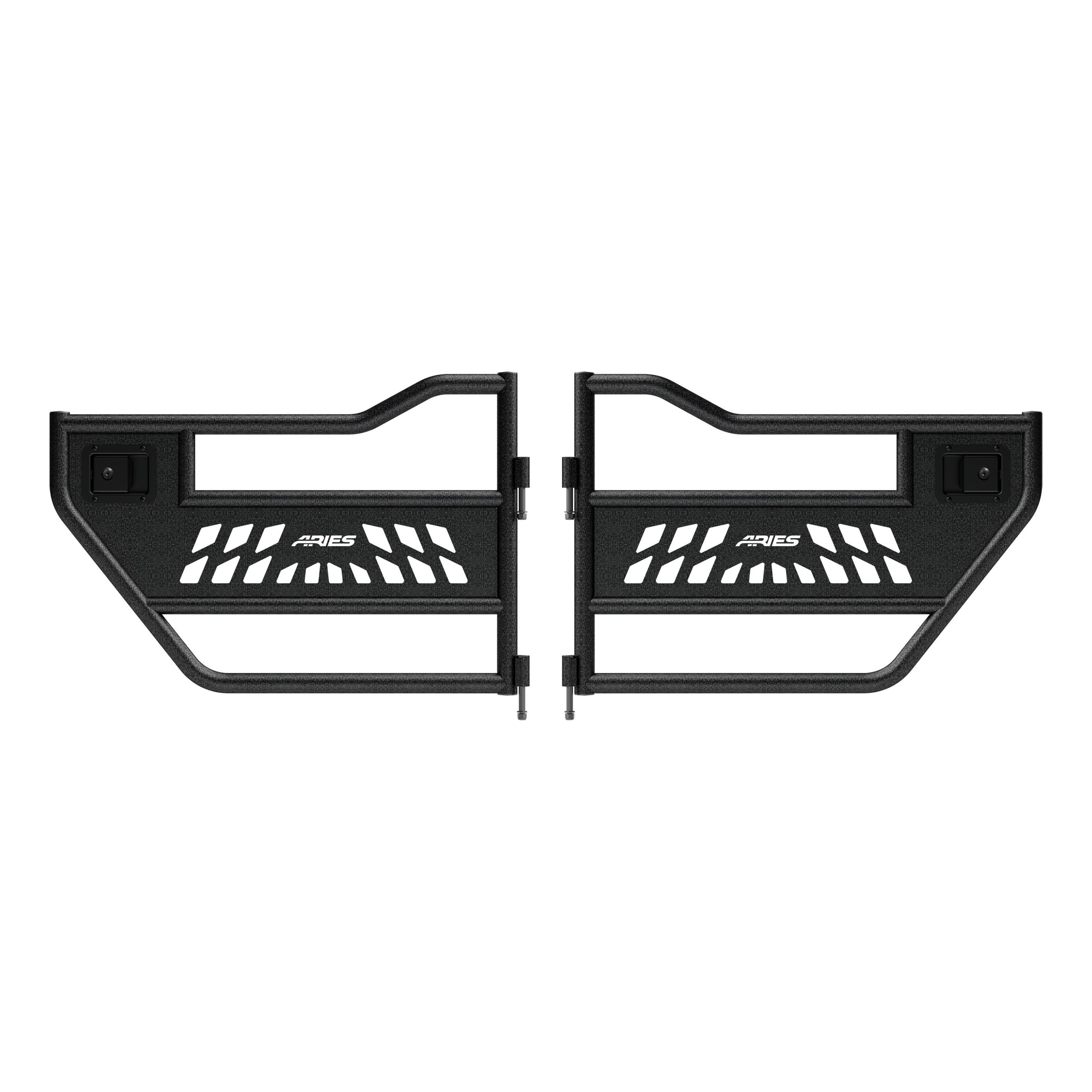 ARIES Jeep tube doors are more than a fancy aftermarket toy for your Jeep Wrangler JL or Jeep Gladiator; they are the key to turning your ride into the ultimate off-roading machine. Their open-concept design and aggressive cutout pattern makes them the perfect accessory for the desert baja and the rock climber alike. To keep your Jeep JL / Gladiator light on its feet over every sand dune, ARIES Jeep tube doors are built to be lightweight while still maintaining superior strength. They are constructed from T6 aluminum alloy, making them strong but far lighter than steel. We also use 100% TIG welds to ensure a solid build and a precise fit on your vehicle. Jeep tube doors are quick to install and easy to remove whenever necessary, using the factory hinge points. They are coated in a durable black powder coat for maximum corrosion resistance, and the unique textured finish of the powder coat helps hide minor scratches and grime from your off-road excursions (NOTE: Before purchasing ARIES Jeep tube doors, it is recommended that you check local and state laws. Some laws may prohibit the use of this product).