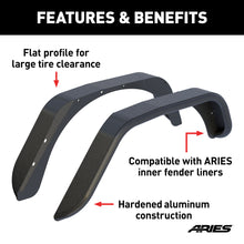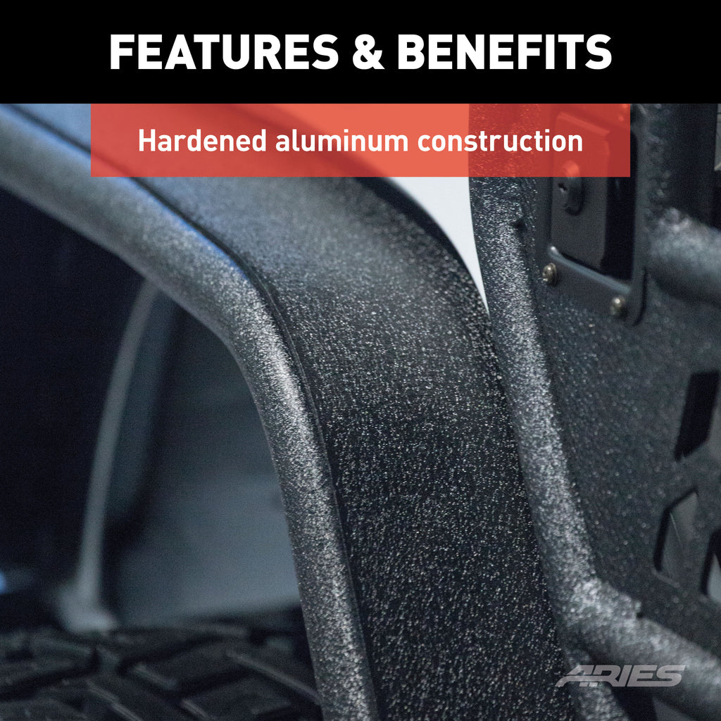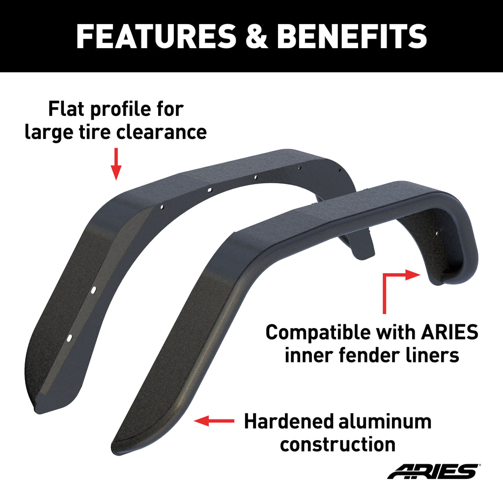 ARIES Jeep fender flares add style and off-road readiness to your Jeep Wrangler JK, featuring rust-free aluminum construction, custom-fit contours and a narrower width to show off larger, off-road tires. Hardened, T6 aluminum alloy construction allows these fender flares to be strong, lightweight and rust-free. To maximum corrosion resistance, they are also covered in a unique textured black powder coat finish that helps hide minor scratches and grime accumulated on the trail. They are also available in paintable, raw aluminum for added customization. ARIES Jeep fender flares are designed to replace the Jeep factory fender flares to better accent larger tires on off-road-style Wranglers. The front set features a 9-1/4" width and the rear set a 5-1/2" width. This gives them a sleek, trail-ready look, while still maintaining excellent functionality. ARIES Jeep fender flares also feature a vehicle-specific contour to offer a precise fit and added style. To add even more off-road-readiness to the Jeep JK, ARIES fender flares are designed to be complemented by ARIES front inner fender liners #1500350. They provide better engine protection than the factory liners and feature powder-coated aluminum construction. ARIES fender flares come with all necessary mounting hardware for a complete installation and are sold in pairs for the front or rear (some drilling may be required).